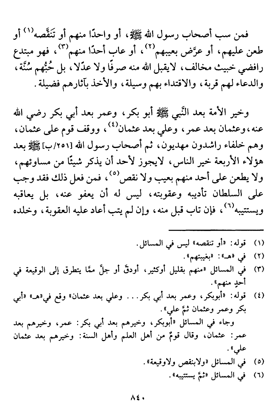 وخير الأمة بعد النَّبي -صلى اللَّه عليه وسلم- أبو بكر، وعمر بعد أبي بكر رضي اللَّه عنه، وعثمان بعد عمر، وعلي بعد عثمان (¬٤) ، ووقف قوم على عثمان، وهم خلفاء راشدون مهديون، ثم أصحاب رسول اللَّه -صلى اللَّه عليه وسلم- بعد هؤلاء الأربعة خير الناس، لا يجوز لأحد أن يذكر شيئًا من مساوئهم، ولا يطعن على أحد منهم بعيب ولا نقص (¬٥) ، فمن فعل ذلك فقد وجب على السلطان تأديبه وعقوبته، ليس له أن يعفو عنه، بل يعاقبه ويستتيبه (¬٦) ، فإن تاب قبل منه، وإن لم يتب أعاد عليه العقوبة، وخلده