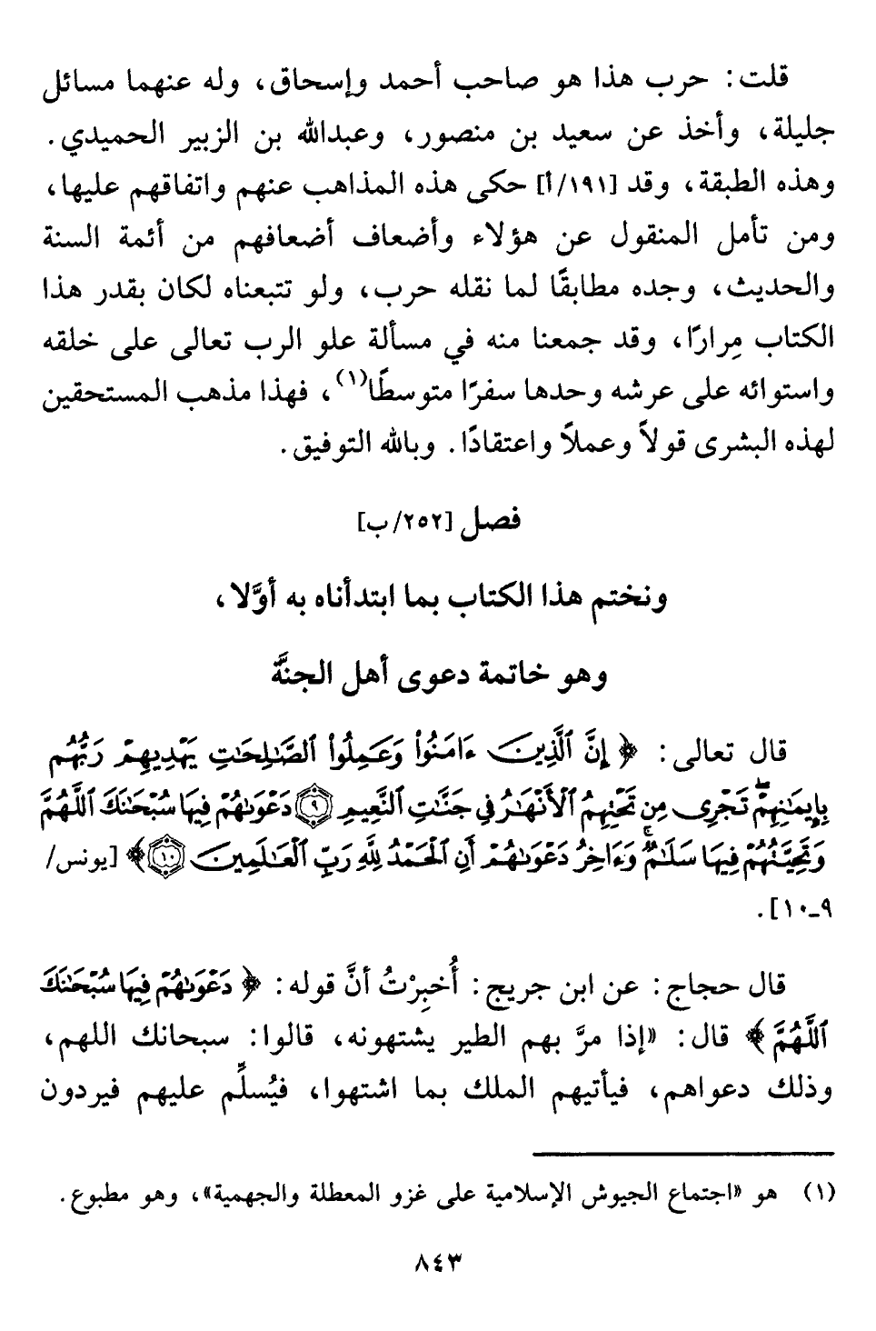 قلت: حرب هذا هو صاحب أحمد وإسحاق، وله عنهما مسائل جليلة، وأخذ عن سعيد بن منصور، وعبد اللَّه بن الزبير الحميدي. وهذه الطبقة، وقد حكى هذه المذاهب عنهم واتفاقهم عليها، ومن تأمل المنقول عن هؤلاء وأضعاف أضعافهم من أئمة السنة والحديث، وجده مطابقًا لما نقله حرب، ولو تتبعناه لكان بقدر هذا الكتاب مِرارًا، وقد جمعنا منه في مسألة علو الرب تعالى على خلقه واستوائه على عرشه وحدها سفرًا متوسطًا (¬١)، فهذا مذهب المستحقين لهذه البشرى قولًا وعملًا واعتقادًا. وباللَّه التوفيق.