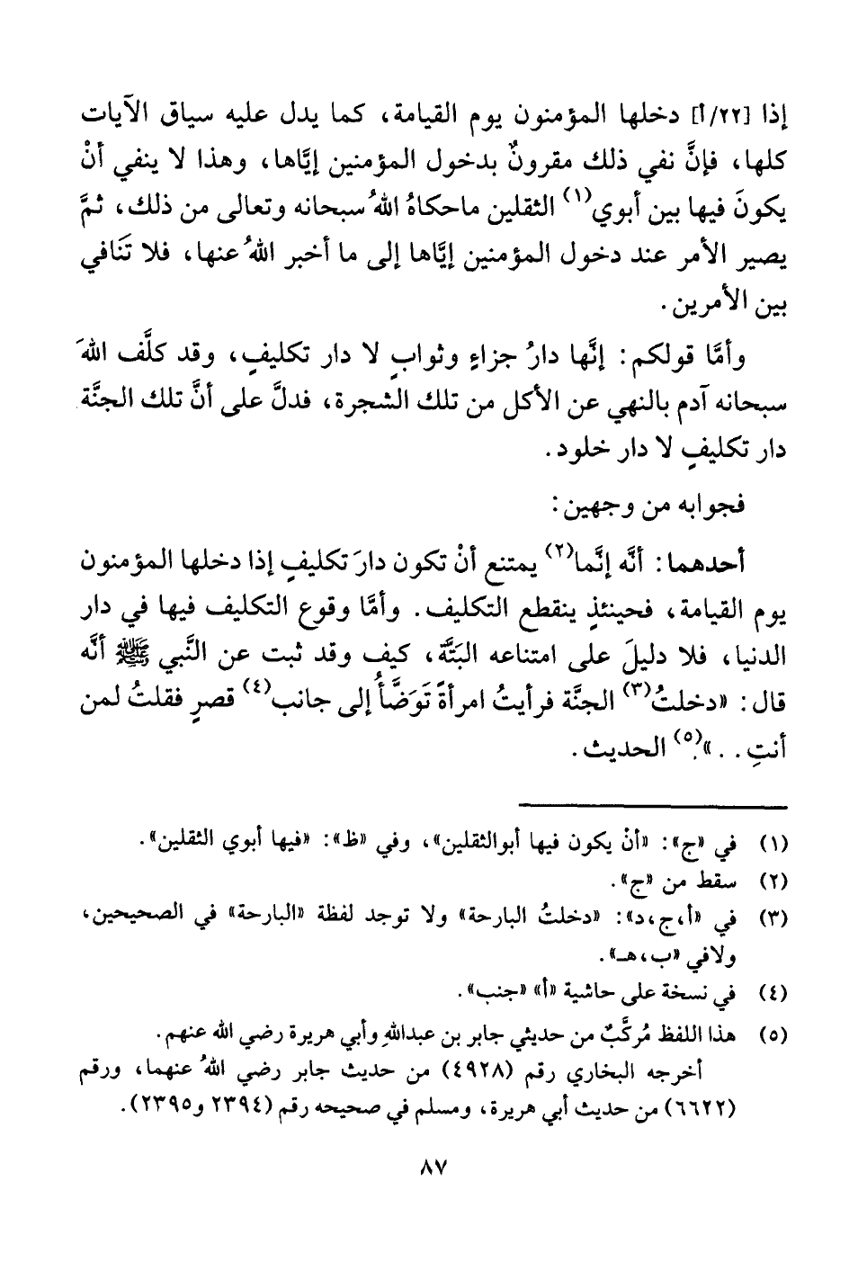 وأمَّا قولكم: إنَّها دارُ جزاءٍ وثوابٍ لا دار تكليفٍ، وقد كلَّف اللَّهَ سبحانه آدم بالنهي عن الأكل من تلك الشجرة، فدلَّ على أنَّ تلك الجنَّة دار تكليفٍ لا دار خلود.