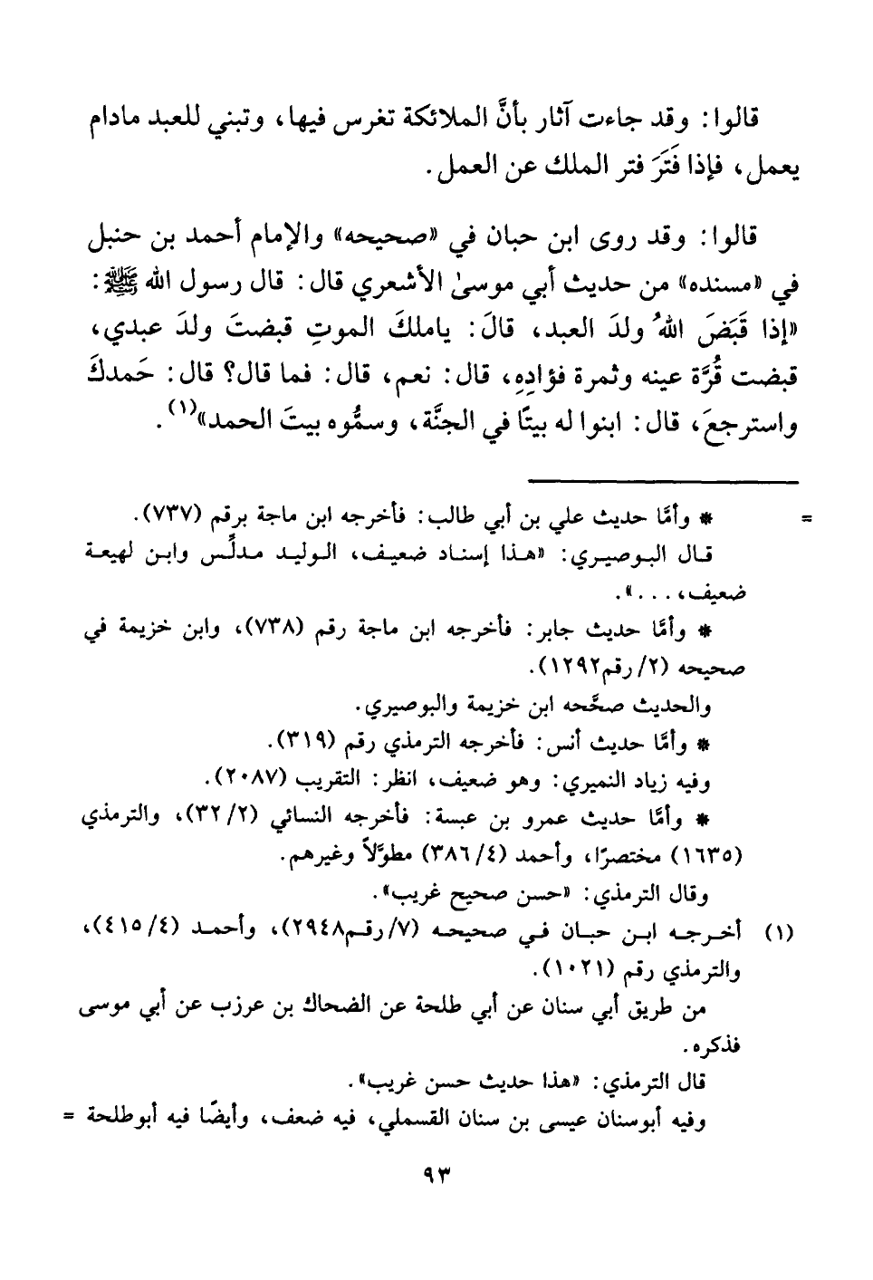 قالوا: وقد روى ابن حبان في "صحيحه" والإمام أحمد بن حنبل في "مسنده" من حديث أبي موسى الأشعري قال: قال رسول اللَّه -صلى اللَّه عليه وسلم-: "إذا قَبَضَ اللَّهُ ولدَ العبد، قالَ: يا ملكَ الموتِ قبضتَ ولدَ عبدي، قبضت قُرَّة عينه وثمرة فؤادِهِ، قال: نعم، قال: فما قال؟ قال: حَمدكَ واسترجعَ، قال: ابنوا له بيتًا في الجنَّة، وسمُّوه بيتَ الحمد" (¬١) .