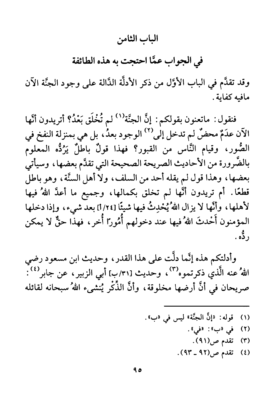 وقد تقدَّم في الباب الأوَّل من ذكر الأدلَّة الدَّالة على وجود الجنَّة الآن ما فيه كفاية.