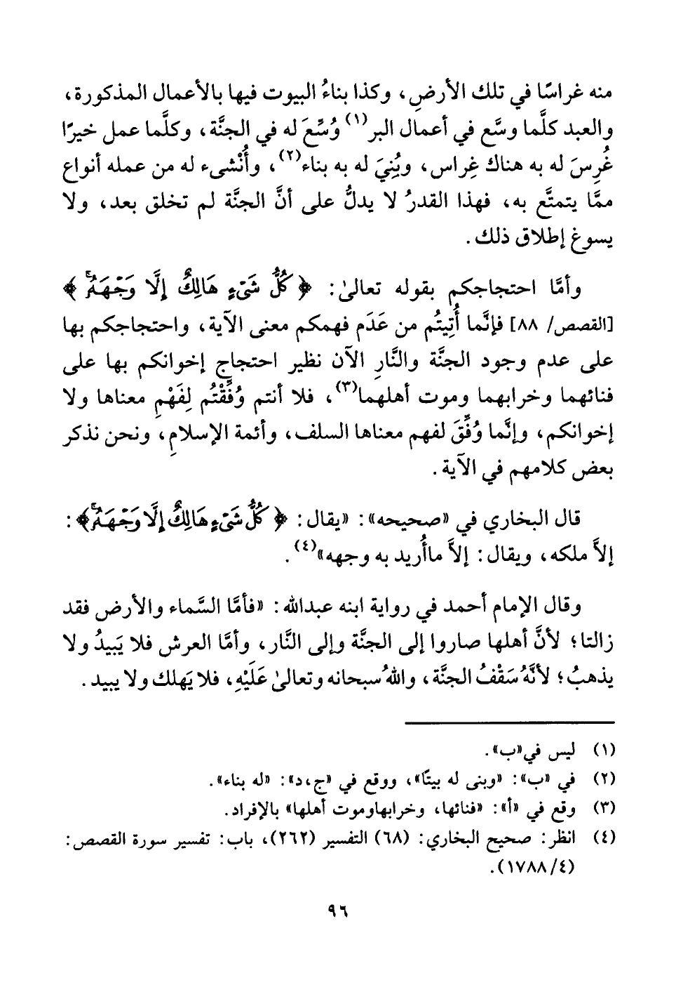 وأمَّا احتجاجكم بقوله تعالى: {كُلُّ شَيْءٍ هَالِكٌ إِلَّا وَجْهَهُ} [القصص: ٨٨] فإنَّما أُتِيتُم من عَدَم فهمكم معنى الآية، واحتجاجكم بها على عدم وجود الجنَّة والنَّارِ الآن نظير احتجاج إخوانكم بها على فنائهما وخرابهما وموت أهلهما (¬٣) ، فلا أنتم وُفِّقْتُم لِفَهْمِ معناها ولا إخوانكم، وإنَّما وُفَّقَ لفهم معناها السلف، وأئمة الإسلامِ، ونحن نذكر بعض كلامهم في الآية.