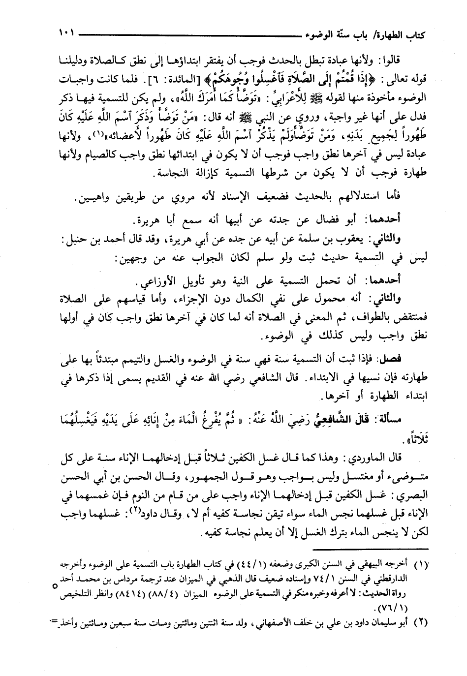 وَالثَّانِي: أَنَّهُ مَحْمُولٌ عَلَى نَفْيِ الْكَمَالِ دُونَ الْإِجْزَاءِ، وَأَمَّا قِيَاسُهُمْ عَلَى الصَّلَاةِ فَمُنْتَقَضٌ بِالطَّوَافِ، ثُمَّ الْمَعْنَى فِي الصَّلَاةِ أَنَّهُ لَمَّا كَانَ فِي آخِرِهَا نُطْقٌ وَاجِبٌ كَانَ فِي أَوَّلِهَا نُطْقٌ وَاجِبٌ وَلَيْسَ كَذَلِكَ فِي الْوُضُوءِ.