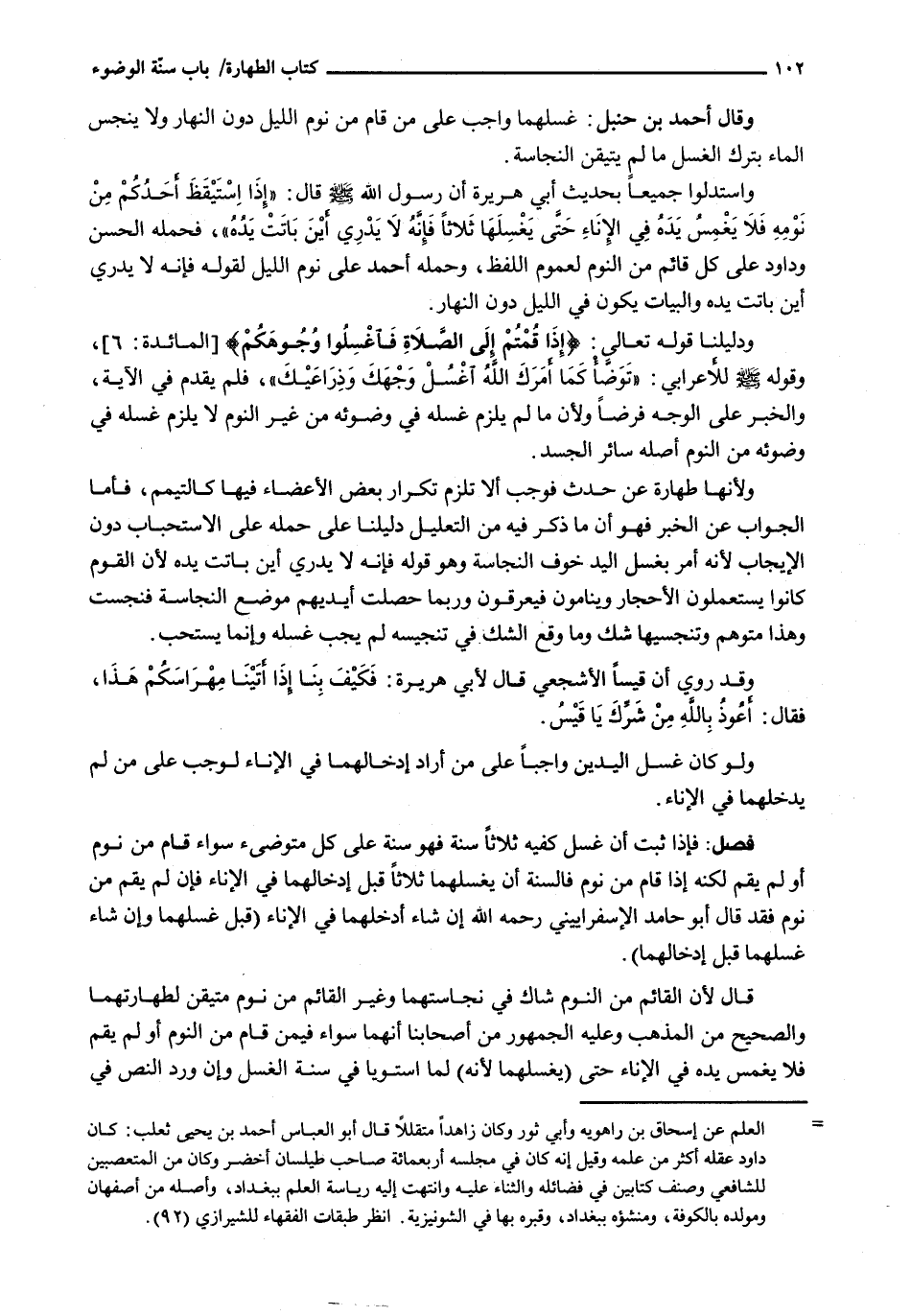 وَقَالَ أَحْمَدُ بْنُ حَنْبَلٍ: غَسْلُهُمَا وَاجِبٌ عَلَى مَنْ قَامَ مِنْ نَوْمِ اللَّيْلِ دُونَ النَّهَارِ وَلَا يُنَجِّسُ الْمَاءَ بِتَرْكِ الْغَسْلِ مَا لَمْ يَتَيَقَّنِ النَّجَاسَةَ.