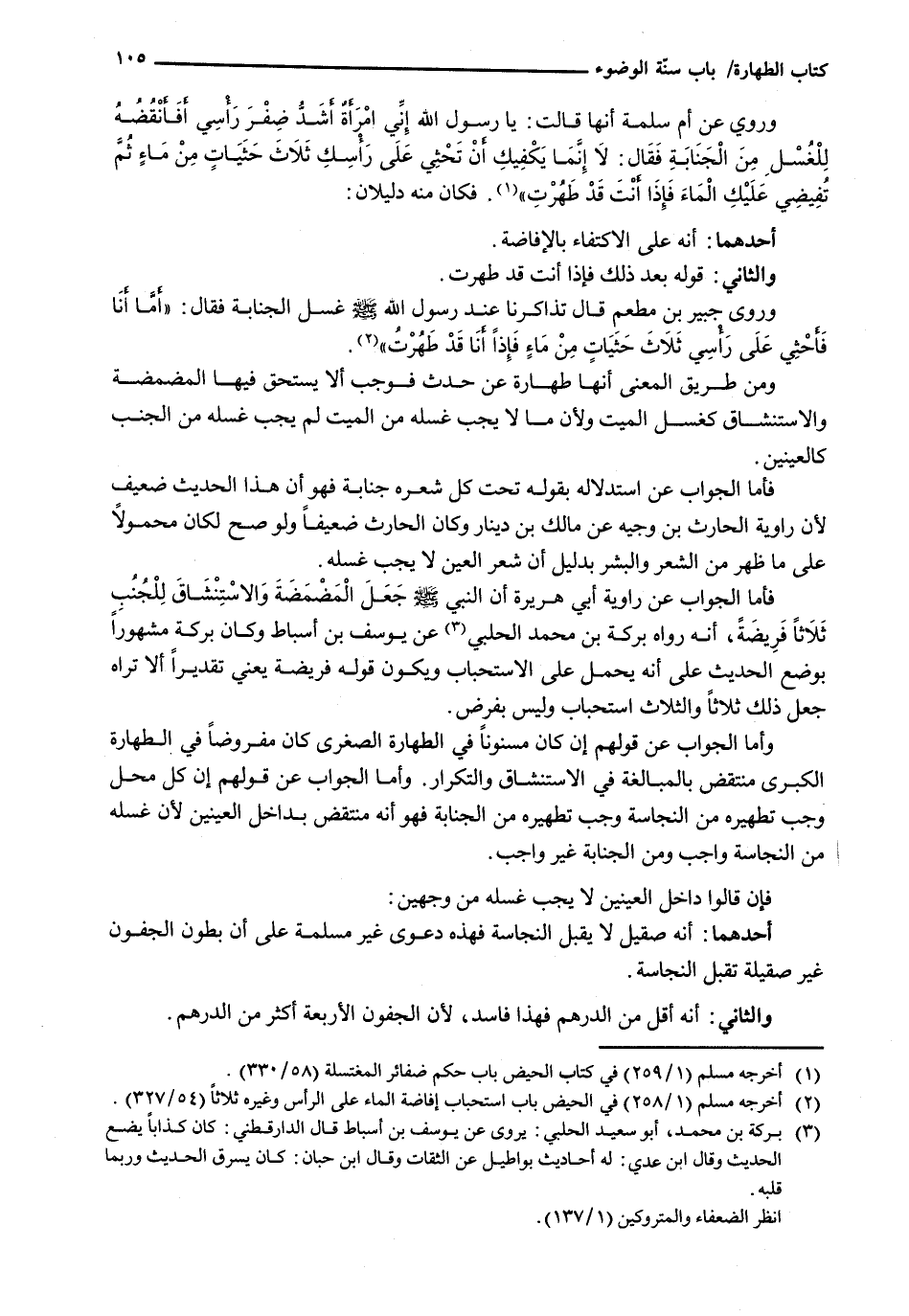 فَأَمَّا الْجَوَابُ عَنِ اسْتِدْلَالِهِ بِقَوْلِهِ تَحْتَ كُلِّ شَعْرَةٍ جَنَابَةٌ فَهُوَ أَنَّ هَذَا الْحَدِيثَ ضَعِيفٌ لِأَنَّ رَاوِيَهُ الْحَارِثُ بْنُ وَجِيهٍ عَنْ مَالِكِ بْنِ دِينَارٍ وَكَانَ الْحَارِثُ ضَعِيفًا وَلَوْ صَحَّ لَكَانَ مَحْمُولًا عَلَى مَا ظَهَرَ مِنَ الشَّعْرِ وَالْبَشَرِ بِدَلِيلِ أَنَّ شَعْرَ الْعَيْنِ لَا يَجِبُ غَسْلُهُ.