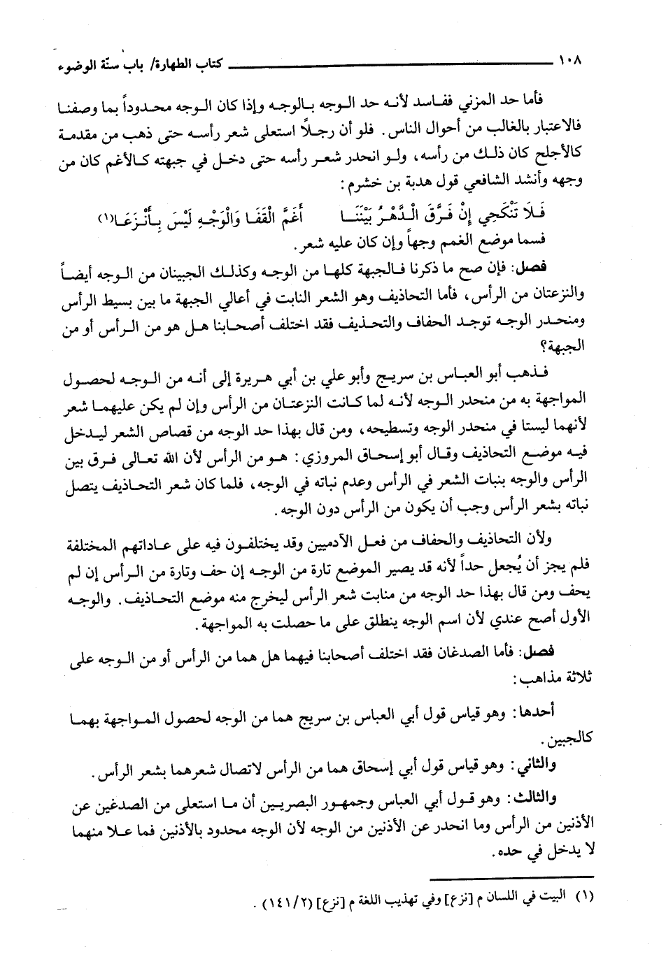 فَأَمَّا حَدُّ الْمُزَنِيِّ فَفَاسِدٌ لِأَنَّهُ حَدَّ الْوَجْهَ بِالْوَجْهِ وَإِذَا كَانَ الْوَجْهُ مَحْدُودًا بِمَا وَصَفْنَا فَالِاعْتِبَارُ بِالْغَالِبِ مِنْ أَحْوَالِ النَّاسِ. فَلَوْ أَنَّ رَجُلًا اسْتَعْلَى شَعْرُ رَأْسِهِ حَتَّى ذَهَبَ مِنْ مُقَدَّمِهِ كَالْأَجْلَحِ كَانَ ذَلِكَ مِنْ رَأْسِهِ، وَلَوِ انْحَدَرَ شَعْرُ رَأْسِهِ حَتَّى دَخَلَ فِي جَبْهَتِهِ كَالْأَغَمِّ كَانَ مِنْ وَجْهِهِ وَأَنْشَدَ الشَّافِعِيُّ قَوْلَ هدبة بن خشرم:
