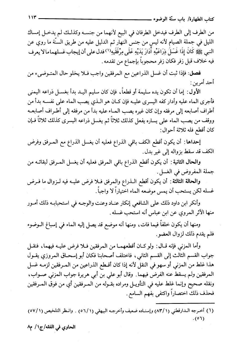 الأول: إما أن تكون يده سليمة أو قطعا، فَإِنْ كَانَ سَلِيمَ الْيَدِ بَدَأَ بِغَسْلِ ذِرَاعِهِ الْيُمْنَى فَأَجْرَى الْمَاءَ عَلَيْهِ وَأَدَارَ كَفَّهُ الْيُسْرَى عَلَيْهِ فَإِنْ كَانَ هُوَ الَّذِي يَصُبُّ الْمَاءَ عَلَى نَفْسِهِ بَدَأَ مِنْ أَطْرَافِ أَصَابِعِهِ إِلَى مِرْفَقِهِ وَإِنْ كَانَ غَيْرُهُ يَصُبُّ الْمَاءَ عَلَيْهِ بَدَأَ مِنْ مِرْفَقِهِ إِلَى أَطْرَافِ أَصَابِعِهِ وَوَقَفَ مَنْ يَصُبُّ الْمَاءَ عَلَى يَسَارِهِ يَفْعَلُ كَذَلِكَ ثَلَاثًا ثُمَّ يَغْسِلُ ذِرَاعَهُ الْيُسْرَى كَذَلِكَ ثَلَاثًا فَإِنْ كَانَ أَقْطَعَ فَلَهُ ثَلَاثَةُ أَحْوَالٍ: