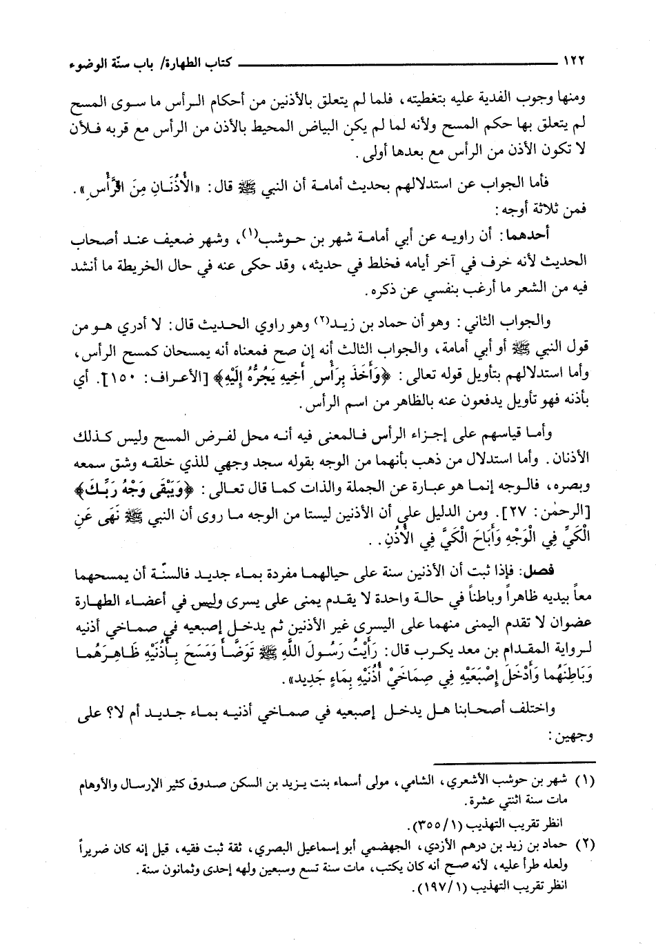 وَالْجَوَابُ الثَّانِي: وَهُوَ أَنَّ حَمَّادَ بْنَ زَيْدٍ وَهُوَ رَاوِي الْحَدِيثِ قَالَ: لَا أَدْرِي هُوَ مِنْ قَوْلِ النَّبِيِّ - صَلَّى اللَّهُ عَلَيْهِ وَسَلَّم َ - أَوْ أَبِي أُمَامَةَ، وَالْجَوَابُ الثَّالِثُ أَنَّهُ إِنْ صَحَّ فَمَعْنَاهُ أَنَّهُ يُمْسَحَانِ كَمَسْحِ الرَّأْسِ، وَأَمَّا اسْتِدْلَالُهُمْ بِتَأْوِيلِ قَوْله تَعَالَى: {وَأَخَذَ بِرَأْسِ أَخِيهِ يَجُرُّهُ إِلَيْهِ) {الأعراف: 150) . أَيْ بِأُذُنِهِ فَهُوَ تَأْوِيلٌ يَدْفَعُونَ عَنْهُ بِالظَّاهِرِ مِنَ اسْمِ الرَّأْسِ.
