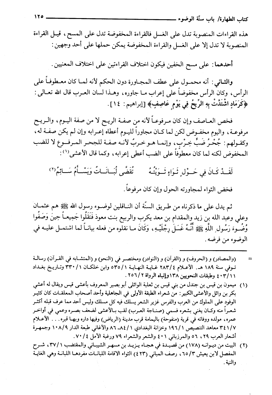هَذِهِ الْقِرَاءَاتُ الْمَنْصُوبَةُ تَدُلُّ عَلَى الْغَسْلِ فَالْقِرَاءَةُ الْمَخْفُوضَةُ تَدُلُّ عَلَى الْمَسْحِ، قِيلَ الْقِرَاءَةُ الْمَنْصُوبَةُ لَا تَدُلُّ إِلَّا عَلَى الْغَسْلِ وَالْقِرَاءَةُ الْمَخْفُوضَةُ يُمْكِنُ حَمْلُهَا عَلَى أَحَدِ وَجْهَيْنِ:
