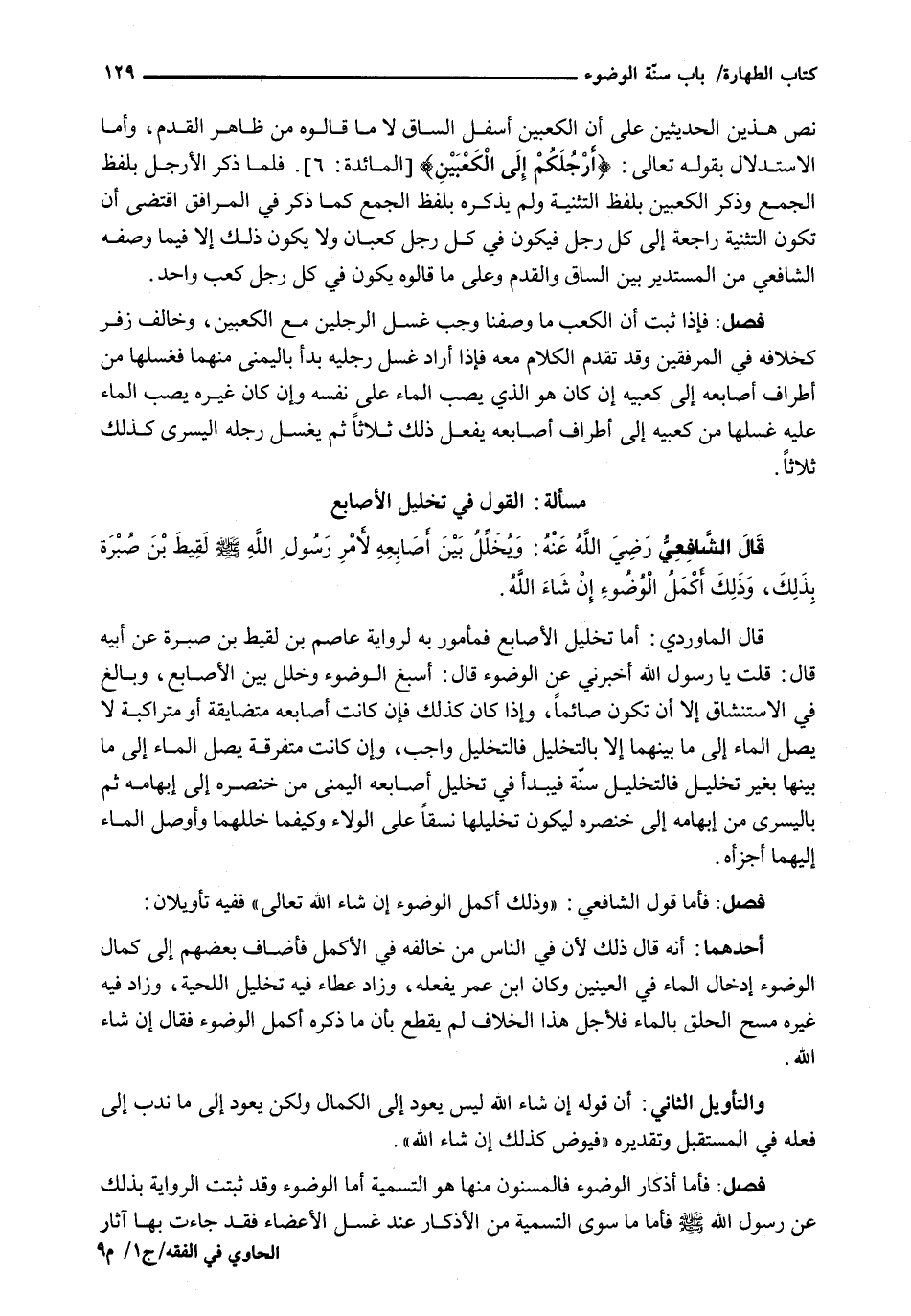 نَصُّ هَذَيْنِ الْحَدِيثَيْنِ عَلَى أَنَّ الْكَعْبَيْنِ أَسْفَلُ السَّاقِ لَا مَا قَالُوهُ مِنْ ظَاهِرِ الْقَدَمِ، وأما الاستدلال بقوله تعالى: {أَرْجُلَكُمْ إِلَى الْكَعْبَيْنِ) {المائدة: 6) . فَلَمَّا ذَكَرَ الْأَرْجُلَ بِلَفْظِ الْجَمْعِ وَذَكَرَ الْكَعْبَيْنِ بِلَفْظِ التَّثْنِيَةِ وَلَمْ يَذْكُرْهُ بِلَفْظِ الْجَمْعِ كَمَا ذَكَرَ فِي الْمَرَافِقِ اقْتَضَى أَنْ تَكُونَ التَّثْنِيَةُ رَاجِعَةً إِلَى كُلِّ رِجْلٍ فَيَكُونُ فِي كُلِّ رِجْلٍ كَعْبَانِ وَلَا يَكُونُ ذَلِكَ إِلَّا فِيمَا وَصَفَهُ الشَّافِعِيُّ مِنَ الْمُسْتَدِيرِ بَيْنَ السَّاقِ وَالْقَدَمِ وَعَلَى مَا قَالُوهُ يَكُونُ فِي كُلِّ رِجْلٍ كَعْبٌ وَاحِدٌ.
