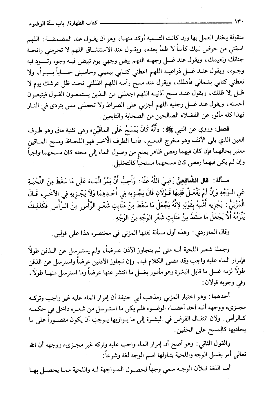 مَنْقُولَةٌ يَخْتَارُ الْعَمَلَ بِهَا وَإِنْ كَانَتِ التَّسْمِيَةُ أَوْكَدَ مِنْهَا، وَهُوَ أَنْ يَقُولَ عِنْدَ الْمَضْمَضَةِ: اللَّهُمَّ اسْقِنِي مِنْ حَوْضِ نَبِيِّكَ كَأْسًا لَا ظمأ بَعْدَهُ، وَيَقُولُ عِنْدَ الِاسْتِنْشَاقِ اللَّهُمَّ لَا تَحْرِمْنِي رَائِحَةَ جِنَانِكَ وَنَعِيمَكَ، وَيَقُولُ عِنْدَ غَسْلِ وَجْهِهِ اللَّهُمَّ بَيِّضْ وَجْهِي يَوْمَ تَبْيَضُّ فِيهِ وُجُوهٌ وتسود فيه وُجُوهٌ، وَيَقُولُ عِنْدَ غَسْلِ ذِرَاعَيْهِ اللَّهُمَّ أَعْطِنِي كِتَابِي بِيَمِينِي وَحَاسِبْنِي حِسَابًا يَسِيرًا، وَلَا تُعْطِنِي كِتَابِي بِشِمَالِي فَأَهْلِكَ، وَيَقُولُ عِنْدَ مَسْحِ رَأْسِهِ اللهم اظللني تَحْتَ ظِلِّ عَرْشِكَ يَوْمَ لَا ظِلَّ إِلَّا ظِلُّكَ، وَيَقُولُ عِنْدَ مَسْحِ أُذُنَيْهِ اللَّهُمَّ اجْعَلْنِي مِنَ الَّذِينَ يَسْتَمِعُونَ الْقَوْلَ فَيَتَّبِعُونَ أَحْسَنَهُ وَيَقُولُ عِنْدَ غَسْلِ رِجْلَيْهِ اللَّهُمَّ أَجِزْنِي عَلَى الصِّرَاطِ وَلَا تَجْعَلْنِي مِمَّنْ يَتَرَدَّى فِي النَّارِ فَهَذَا كُلُّهُ مَأْثُورٌ عَنِ الْفُضَلَاءِ الصَّالِحِينَ مِنَ الصَّحَابَةِ والتابعين.