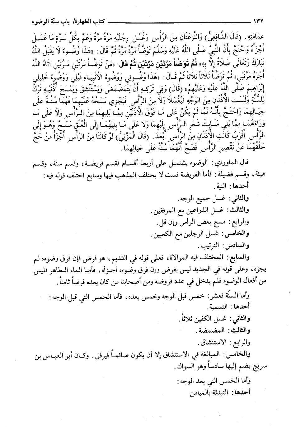 قال الْمَاوَرْدِيُّ: الْوُضُوءُ يَشْتَمِلُ عَلَى أَرْبَعَةِ أَقْسَامٍ فَقِسْمٌ فَرِيضَةٌ، وَقِسْمٌ سُنَّةٌ، وَقِسْمٌ هَيْئَةٌ، وَقِسْمٌ فَضِيلَةٌ: فَأَمَّا الْفَرِيضَةُ فَسِتٌّ لَا يَخْتَلِفُ الْمَذْهَبُ فِيهَا وَسَابِعٌ اخْتَلَفَ قَوْلُهُ فِيهِ: