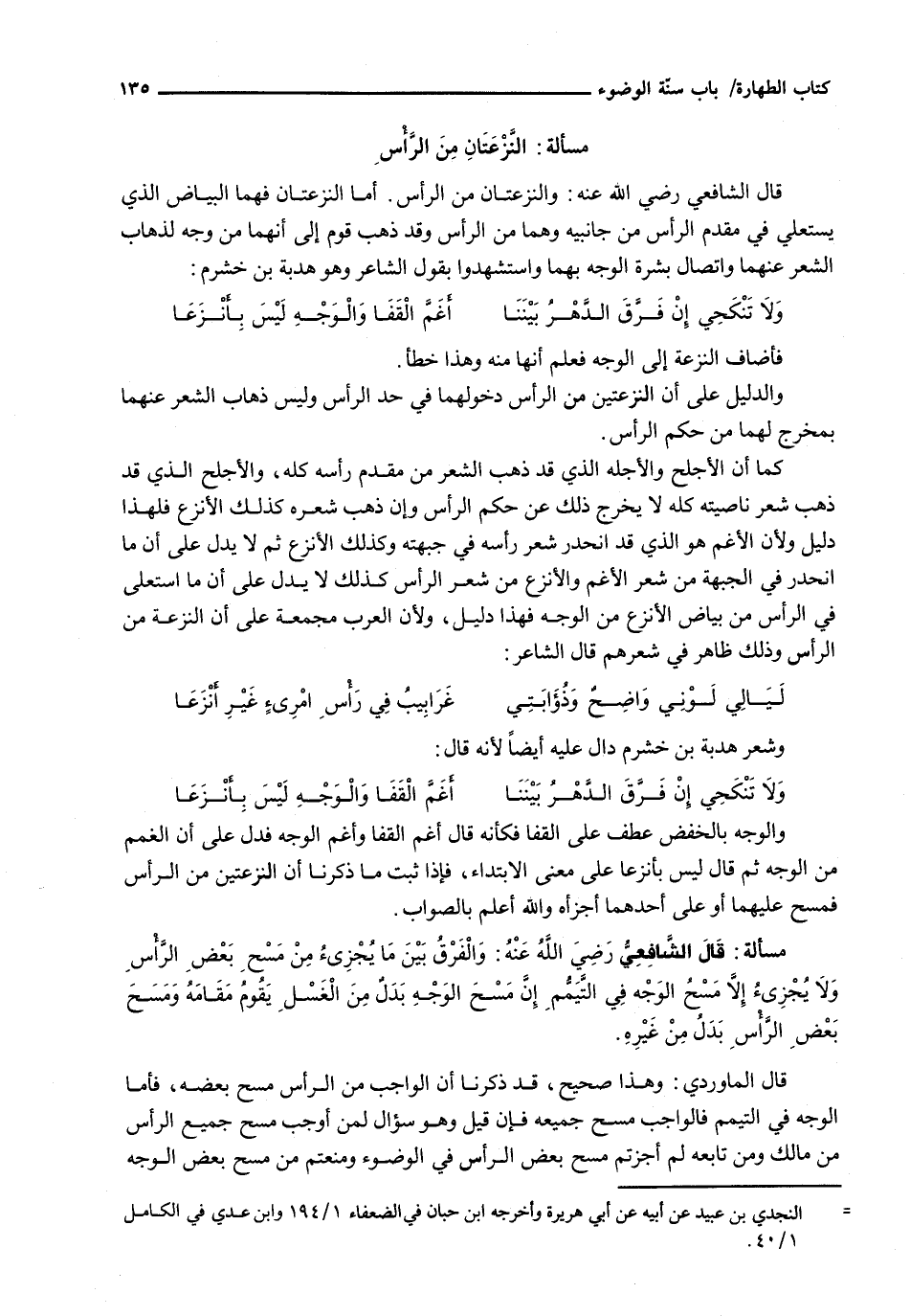 قال الشافعي رضي الله عنه: والنزعتان من الرأس. أَمَّا النَّزْعَتَانِ فَهُمَا الْبَيَاضُ الَّذِي يَسْتَعْلِي فِي مُقَدَّمِ الرَّأْسِ مِنْ جَانِبَيْهِ وَهُمَا مِنَ الرَّأْسِ وقد ذهب قوم إلى أنهما من وجه لِذَهَابِ الشَّعْرِ عَنْهُمَا وَاتِّصَالِ بَشَرَةِ الْوَجْهِ بِهِمَا وَاسْتَشْهَدُوا بِقَوْلِ الشَّاعِرِ وَهُوَ هُدْبَةُ بْنُ خَشْرَمٍ:
