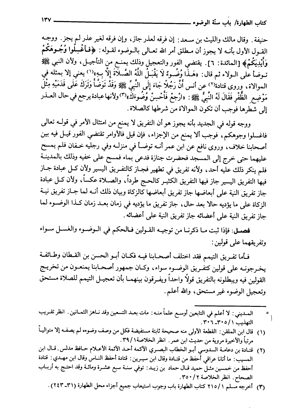 حنيفة. وَقَالَ مَالِكٌ وَاللَّيْثُ بْنُ سَعْدٍ: إِنْ فَرَّقَهُ لِعُذْرٍ جَازَ، وَإِنْ فَرَّقَهُ لِغَيْرِ عُذْرٍ لَمْ يَجُزْ. وَوَجْهُ الْقَوْلِ الْأَوَّلِ بِأَنَّهُ لَا يَجُوزُ أَنَّ مُطْلَقَ أَمْرِ اللَّهِ تَعَالَى بِالْوُضُوءِ لِقَوْلِهِ: {فَاغْسِلُوا وُجُوهَكُمْ وَأَيْدِيَكُمْ) {المائدة: 6) . يَقْتَضِي الْفَوْرَ وَالتَّعْجِيلَ وَذَلِكَ يَمْنَعُ مِنَ التَّأْجِيلِ، وَلِأَنَّ النَّبِيَّ - صَلَّى اللَّهُ عَلَيْهِ وَسَلَّم َ - تَوَضَّأَ عَلَى الْوَلَاءِ ثُمَّ قَالَ: " هَذَا وضوءٌ لَا يَقْبَلُ اللَّهُ الصَّلَاةَ إِلَّا بِهِ " يَعْنِي إِلَّا بِمِثْلِهِ فِي الْمُوَالَاةِ، وَرَوَى قَتَادَةُ عَنْ أَنَسٍ أَنَّ رَجُلًا جَاءَ إِلَى النَبِيِّ - صَلَّى اللَّهُ عَلَيْهِ وَسَلَّم َ - وَقَدْ تَوَضَّأَ وَتَرَكَ عَلَى قَدَمَيْهِ مِثْلَ مَوْضِعِ الظُّفُرِ فَقَالَ لَهُ النَّبِيُّ - صَلَّى اللَّهُ عَلَيْهِ وَسَلَّم َ -: " ارْجِعْ فَأَحْسِنْ وُضُوءَكَ " وَلِأَنَّهَا عِبَادَةٌ يَرْجِعُ فِي حَالِ الْعُذْرِ إِلَى شَطْرِهَا فَوَجَبَ أَنْ تَكُونَ الْمُوَالَاةُ مِنْ شَرْطِهَا كَالصَّلَاةِ.
