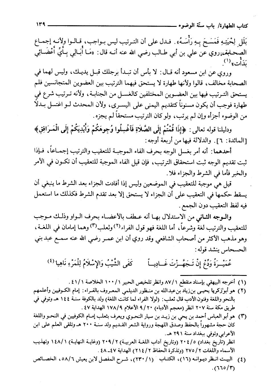 وَالْوَجْهُ الثَّانِي مِنَ الِاسْتِدْلَالِ بِهَا أَنَّهُ عَطْفٌ بِالْأَعْضَاءِ بِحَرْفِ الْوَاوِ وَذَلِكَ مُوجِبٌ لِلتَّعْقِيبِ وَالتَّرْتِيبِ لُغَةً وَشَرْعًا، أَمَّا اللُّغَةُ فَهُوَ قَوْلُ الْفَرَّاءِ وَثَعْلَبٍ وَهُمَا إِمَامَانِ فِي اللُّغَةِ، وَهُوَ مَذْهَبُ الْأَكْثَرِ مِنْ أصحاب الشافعي وَقَدْ رُوِيَ أَنَّ ابْنَ عُمَرَ رَضِيَ اللَّهُ عَنْهُ سَمِعَ عَبْدَ بَنِي الْحِسْحَاسِ يُنْشِدُ قَوْلَهُ: