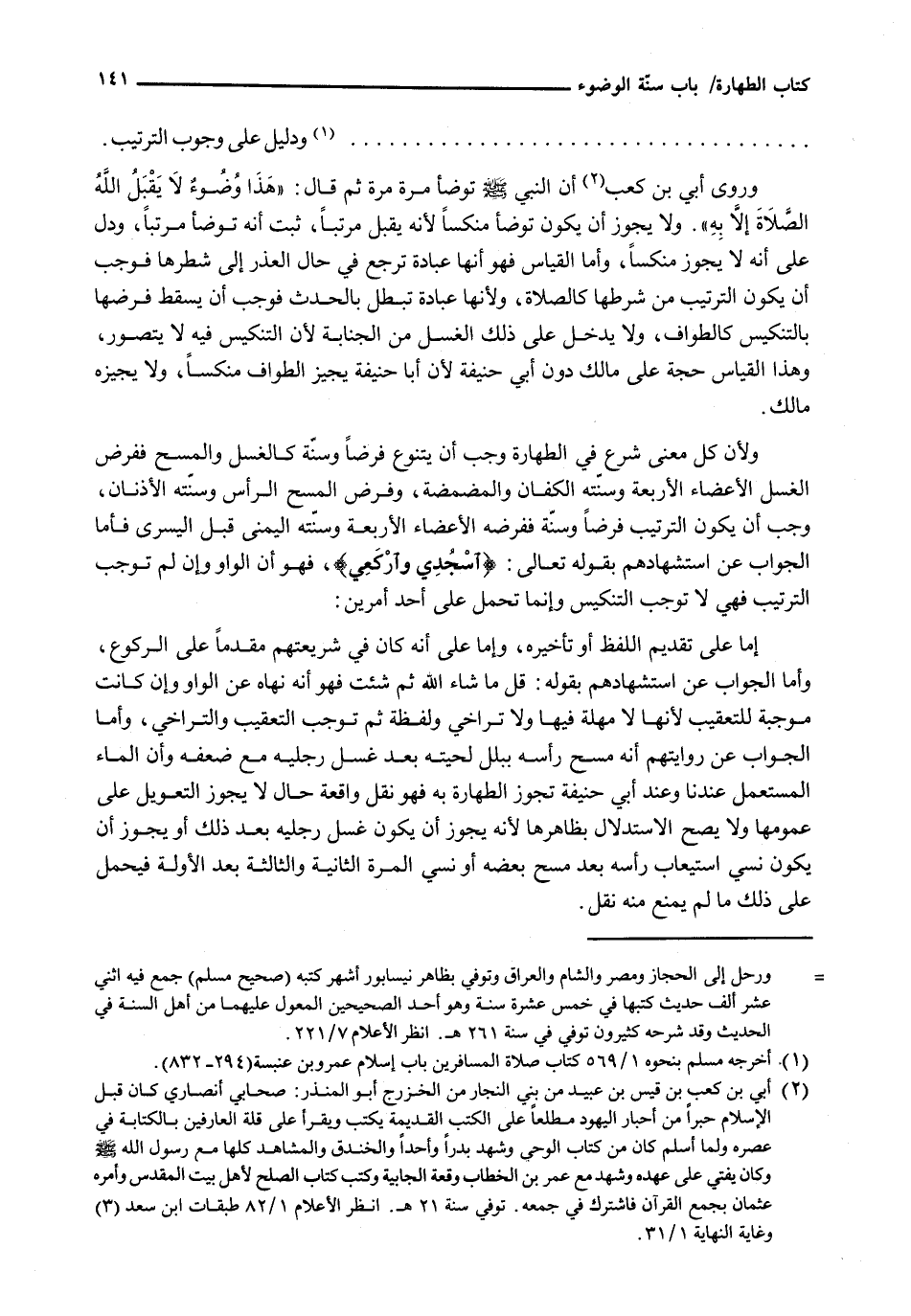 إِمَّا عَلَى تَقْدِيمِ اللَّفْظِ أَوْ تَأْخِيرِهِ، وَإِمَّا عَلَى أَنَّهُ كَانَ فِي شَرِيعَتِهِمْ مُقَدَّمًا عَلَى الرُّكُوعِ، وَأَمَّا الْجَوَابُ عَنِ اسْتِشْهَادِهِمْ بِقَوْلِهِ: قُلْ مَا شَاءَ اللَّهُ ثُمَّ شِئْتُ فَهُوَ أَنَّهُ نَهَاهُ عَنِ الْوَاوِ وَإِنْ كَانَتْ مُوجِبَةً لِلتَّعْقِيبِ لِأَنَّهَا لَا مُهْلَةَ فِيهَا وَلَا تَرَاخِيَ وَلَفْظَةُ ثُمَّ تُوجِبُ التَّعْقِيبَ وَالتَّرَاخِيَ، وَأَمَّا الْجَوَابُ عَنْ رِوَايَتِهِمْ أَنَّهُ مَسَحَ رَأْسَهُ بِبَلَلِ لِحْيَتِهِ بَعْدَ غَسْلِ رِجْلَيْهِ مَعَ ضَعْفِهِ وَأَنَّ الْمَاءَ الْمُسْتَعْمَلَ عِنْدَنَا وَعِنْدَ أبي حنيفة تَجُوزُ الطَّهَارَةُ بِهِ فَهُوَ نَقْلُ وَاقِعَةِ حَالٍ لَا يَجُوزُ التَّعْوِيلُ عَلَى عُمُومِهَا وَلَا يَصِحُّ الِاسْتِدْلَالُ بِظَاهِرِهَا لِأَنَّهُ يَجُوزُ أَنْ يَكُونَ غَسَلَ رِجْلَيْهِ بَعْدَ ذَلِكَ أَوْ يَجُوزُ أَنْ يَكُونَ نَسِيَ اسْتِيعَابَ رَأْسِهِ بَعْدَ مَسْحِ بَعْضِهِ أَوْ نَسِيَ المرة الثانية والثالثة بعد الأولة فَيُحْمَلُ عَلَى ذَلِكَ مَا لَمْ يَمْنَعْ مِنْهُ نقل.