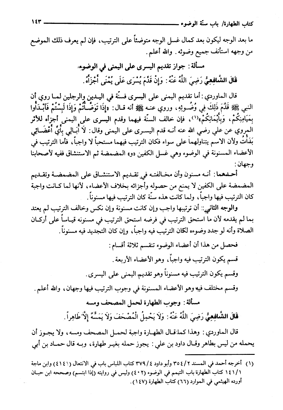 قال الْمَاوَرْدِيُّ: أَمَّا تَقْدِيمُ الْيُمْنَى عَلَى الْيُسْرَى فَسُنَّةٌ فِي الْيَدَيْنِ وَالرِّجْلَيْنِ لِمَا رُوِيَ أَنَّ النَّبِيَّ - صَلَّى اللَّهُ عَلَيْهِ وَسَلَّم َ - قَدَّمَ ذَلِكَ فِي وُضُوئِهِ، وَرُوِيَ عَنْهُ - صَلَّى اللَّهُ عَلَيْهِ وَسَلَّم َ - أنه قال: " إذا توضأتم وإذا لبستم فابدأوا بِمَيَامِنِكُمْ، وَبِأَيْمَانِكُمْ "، فَإِنْ خَالَفَ السُّنَّةَ فِيهِمَا وَقَدَّمَ الْيُسْرَى عَلَى الْيُمْنَى أَجْزَأَهُ لِلْأَثَرِ الْمَرْوِيِّ عَنْ عَلِيٍّ رَضِيَ اللَّهُ عَنْهُ أَنَّهُ قَدَّمَ الْيُسْرَى عَلَى الْيُمْنَى وَقَالَ: لَا أُبَالِي بِأَيِّ أَعْضَائِي بَدَأْتُ وَلِأَنَّ الِاسْمَ يَتَنَاوَلُهُمَا عَلَى سَوَاءٍ فَكَانَ التَّرْتِيبُ فِيهِمَا مُسْتَحَبًّا لَا وَاجِبًا، فَأَمَّا التَّرْتِيبُ فِي الْأَعْضَاءِ الْمَسْنُونَةِ فِي الْوُضُوءِ وَهِيَ غَسْلُ الْكَفَّيْنِ " وَ " الْمَضْمَضَةُ ثُمَّ الِاسْتِنْشَاقُ فَفِيهِ لِأَصْحَابِنَا وَجْهَانِ: