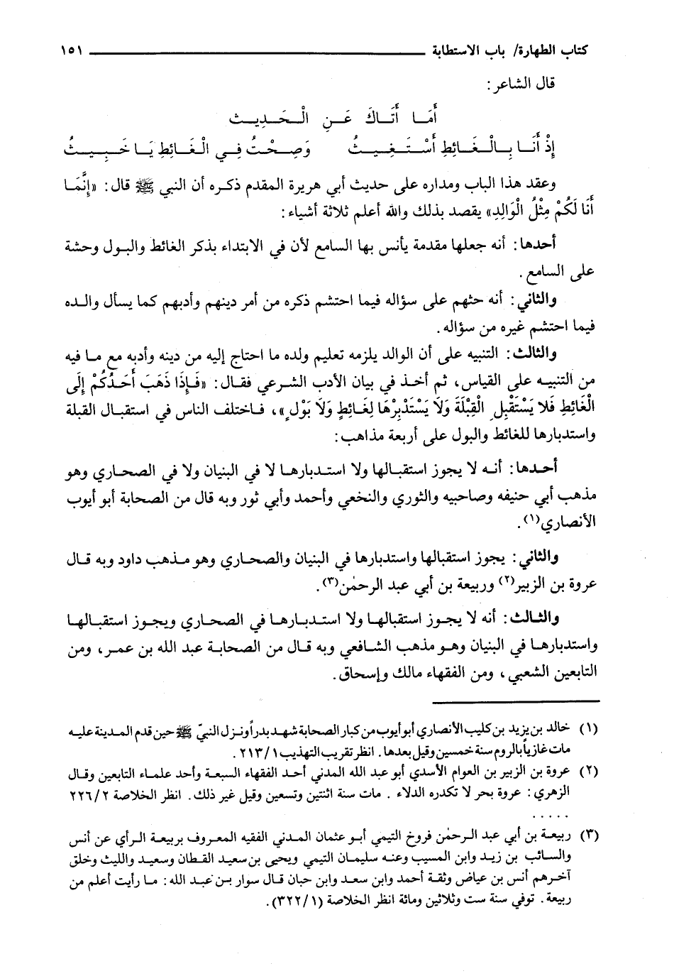 وَالثَّالِثُ: التَّنْبِيهُ عَلَى أَنَّ الْوَالِدَ يَلْزَمُهُ تَعْلِيمُ وَلَدِهِ مَا احْتَاجَ إِلَيْهِ مِنْ دِينِهِ وَأَدَبِهِ مَعَ مَا فِيهِ مِنَ التَّنْبِيهِ عَلَى الْقِيَاسِ، ثُمَّ أَخَذَ فِي بَيَانِ الْأَدَبِ الشَّرْعِيِّ فَقَالَ: " فَإِذَا ذهب أحدكم إلى الغائط فلا يستقبل القبلة وَلَا يَسْتَدْبِرْهَا لِغَائِطٍ وَلَا بولٍ "، فَاخْتَلَفَ النَّاسُ فِي اسْتِقْبَالِ الْقِبْلَةِ وَاسْتِدْبَارِهَا لِلْغَائِطِ وَالْبَوْلِ عَلَى أَرْبَعَةِ مَذَاهِبَ: