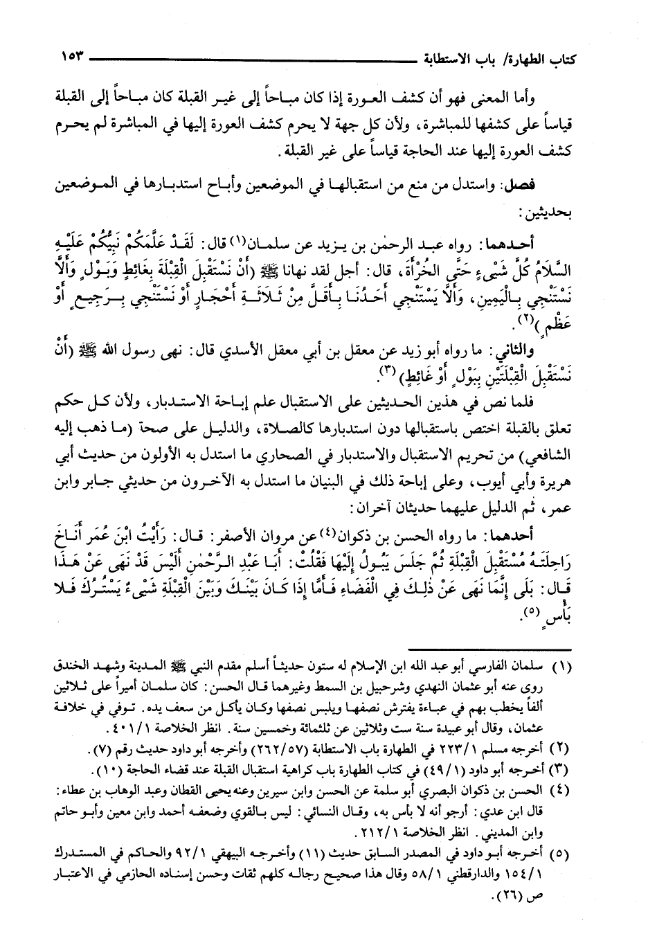 أَحَدُهُمَا: رَوَاهُ عَبْدُ الرَّحْمَنِ بْنُ يَزِيدَ عَنْ سَلْمَانَ قَالَ: لَقَدْ عَلَّمَكُمْ نَبِيُّكُمْ عَلَيْهِ السَّلَامُ كُلَّ شيءٍ حتى الخرأة، قَالَ: أَجَلٌ لَقَدْ نَهَانَا - صَلَّى اللَّهُ عَلَيْهِ وَسَلَّم َ - (أَنْ نَسْتَقْبِلَ الْقِبْلَةَ بغائطٍ وبولٍ وَأَلَّا نَسْتَنْجِيَ بِالْيَمِينِ، وَأَلَّا يَسْتَنْجِيَ أَحَدُنَا بِأَقَلَّ مِنْ ثَلَاثَةِ أحجارٍ أَوْ نَسْتَنْجِيَ برجيعٍ أَوْ عظمٍ) .