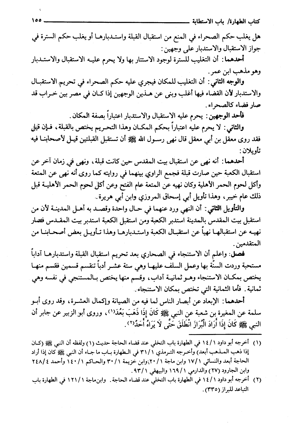 : وأعلم أن الاستنجاء فِي الصَّحَارِي بَعْدَ تَحْرِيمِ اسْتِقْبَالِ الْقِبْلَةِ وَاسْتِدْبَارِهَا آدَابًا مُسْتَحَبَّةً وَرَدَتِ السُّنَّةُ بِهَا وَعَمِلَ السَّلَفُ عَلَيْهَا وَهِيَ سِتَّةَ عَشَرَ أَدَبًا تَنْقَسِمُ قِسْمَيْنِ فقسم منها مختص بِمَكَانِ الِاسْتِنْجَاءِ وَهُوَ ثَمَانِيَةُ آدَابٍ، وَقِسْمٌ مِنْهَا يَخْتَصُّ بِالْمُسْتَنْجِي فِي نَفْسِهِ وَهِيَ ثَمَانِيَةٌ. فَأَمَّا الثمانية التي تختص بمكان الاستنجاء.