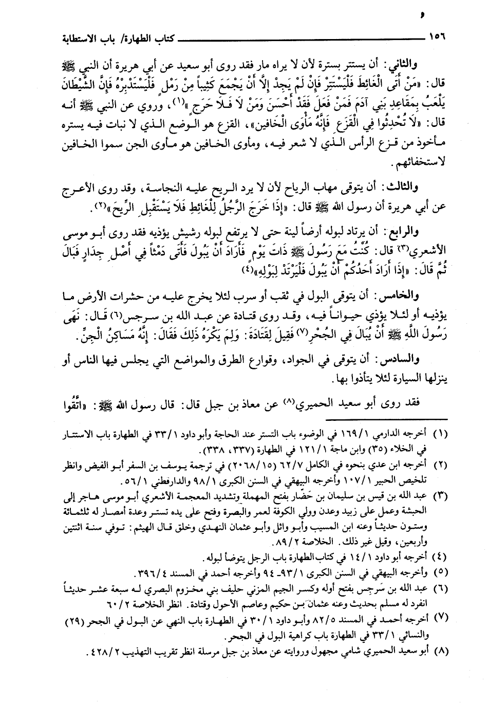 وَالسَّادِسُ: أن يتوقى في الجواد، وَقَوَارِعَ الطُّرُقِ وَالْمَوَاضِعِ الَّتِي يَجْلِسُ فِيهَا النَّاسُ أَوْ يَنْزِلُهَا السَّيَّارَةُ لِئَلَّا يَتَأَذَّوْا بِهَا.