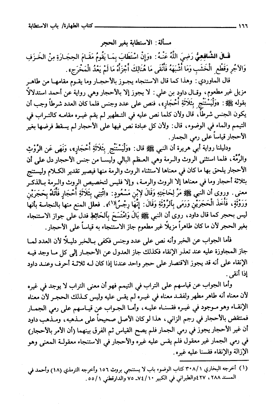 فَأَمَّا الْجَوَابُ عَنِ الْخَبَرِ وَأَنَّهُ نَصَّ عَلَى عَدَدٍ وَجِنْسٍ فَكَفَى بِالْخَبَرِ دَلِيلًا لِأَنَّ الْعَدَدَ لَمَّا جَازَ الْمُجَاوَزَةُ عَلَيْهِ عِنْدَ تَعَذُّرِ الْإِنْقَاءِ فَكَذَلِكَ جَازَ الْعُدُولُ عَنِ الْأَحْجَارِ إِلَى كُلِّ مَا وُجِدَ فِيهِ الْإِنْقَاءُ عَلَى أَنَّهُ قَدْ يَجُوزُ الِاقْتِصَارُ عَلَى حَجَرٍ وَاحِدٍ عِنْدَنَا إِذَا كَانَ لَهُ ثَلَاثَةُ أَحْرُفٍ وَعِنْدَ دَاوُدَ إِذَا أَنْقَى.