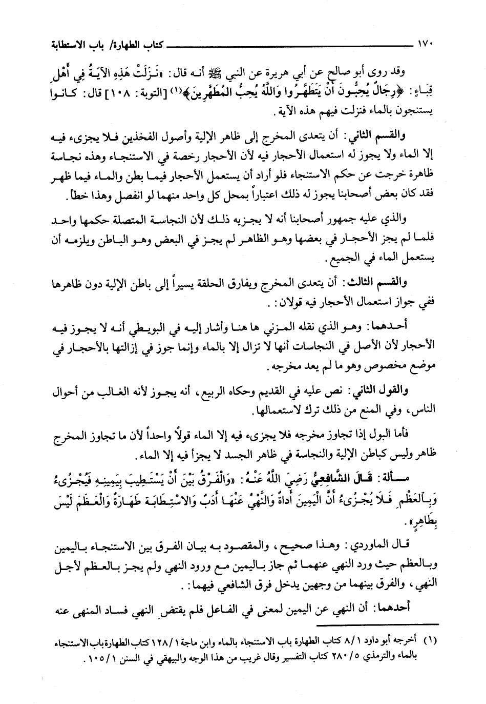 قَالَ الْمَاوَرْدِيُّ: وَهَذَا صَحِيحٌ، وَالْمَقْصُودُ بِهِ بَيَانُ الْفَرْقِ بَيْنَ الِاسْتِنْجَاءِ بِالْيَمِينِ وَبِالْعَظْمِ حَيْثُ وَرَدَ النَّهْيُ عَنْهُمَا ثُمَّ جَازَ بِالْيَمِينِ مَعَ وُرُودِ النَّهْيِ وَلَمْ يَجُزْ بِالْعَظْمِ لِأَجْلِ النَّهْيِ، وَالْفَرْقُ بَيْنَهُمَا مِنْ وَجْهَيْنِ يَدْخُلُ فَرْقُ الشَّافِعِيِّ فِيهِمَا: