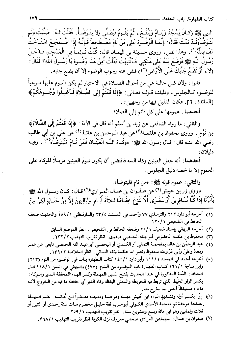 النبي - صَلَّى اللَّهُ عَلَيْهِ وَسَلَّم َ - (كَانَ يَسْجُدُ وَيَنَامُ وَيَنْفُخُ، ثُمَّ يَقُومُ فَيُصَلِّي وَلَا يَتَوَضَأُ. فَقُلْتُ لَهُ: صَلَّيْتَ وَلَمْ تَتَوَضَّأْ وَقَدْ نِمْتَ فَقَالَ: إِنَّمَا الْوُضُوءُ عَلَى مَنْ نَامَ مُضْطَجِعًا فَإِنَهُ إِذَا اضْطَجَعَ اسْتَرْخَتْ مَفَاصِلُهُ، وَهَذَا نَصٌّ، وَرَوَى حُذَيْفَةُ بْنُ الْيَمَانِ قَالَ: كُنْتُ نَائِمًا فِي الْمَسْجِدِ فَدَخَلَ رَسُولُ اللَّهِ - صَلَّى اللَّهُ عَلَيْهِ وَسَلَّم َ - فَوَضَعَ يَدَهُ عَلَى مَنْكِبِي فَانْتَبَهْتُ فَقُلْتُ أَمِنْ هَذَا وضوءٌ يَا رَسُولَ اللَّهِ؟ فَقَالَ: (لَا، أَوْ تَضَعُ جَنْبَكَ عَلَى الْأَرْضِ) فَنَفَى عَنْهُ وُجُوبَ الْوُضُوءِ إِلَّا أَنْ يَضَعَ جَنْبَهُ.