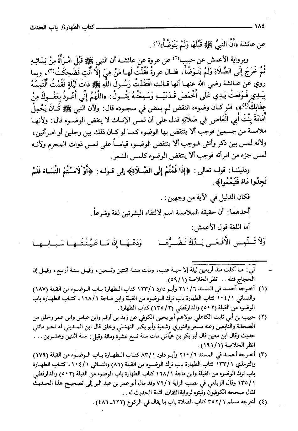 وَبِرِوَايَةِ الْأَعْمَشِ عَنِ حَبِيبٍ عَنْ عُرْوَةَ عَنْ عَائِشَةَ أَنَّ النَّبِيَّ - صَلَّى اللَّهُ عَلَيْهِ وَسَلَّم َ - قَبَّلَ امْرَأَةً مِنْ نِسَائِهِ ثُمَّ خَرَجَ إِلَى الصَّلَاةِ وَلَمْ يَتَوَضَّأْ، فَقَالَ عُرْوَةُ فَقُلْتُ لَهَا مَنْ هِيَ إِلَّا أَنْتِ فَضَحِكَتْ، وَبِمَا رُوِيَ عَنْ عَائِشَةَ رَضِيَ اللَّهُ عَنْهَا أَنَّهَا قَالَتْ افْتَقَدْتُ رَسُولَ اللَّهِ - صَلَّى اللَّهُ عَلَيْهِ وَسَلَّم َ - ذَاتَ ليلةٍ فَقُمْتُ أَلْتَمِسُهُ بِيَدِي فَوَقَعَتْ يَدِي على أخمس قَدَمَيْهِ وَسَمِعْتُهُ يَقُولُ: " اللَّهُمَّ إِنِّي أَعُوذُ بِعَفْوِكَ مِنْ عِقَابِكَ "، فَلَوْ كَانَ وُضُوءُهُ انْتَقَضَ لَمْ يَمْضِ فِي سُجُودِهِ قَالَ: وَلِأَنَّ النَّبِيَّ - صَلَّى اللَّهُ عَلَيْهِ وَسَلَّم َ - كَانَ يَحْمِلُ أُمَامَةَ بِنْتَ أَبِي الْعَاصِ فِي صَلَاتِهِ فَدَلَّ عَلَى أَنَّ لَمْسَ الْإِنَاثِ لَا يَنْقُضُ الْوُضُوءَ قَالَ: وَلِأَنَّهَا مُلَامَسَةٌ مِنْ جِسْمَيْنِ فَوَجَبَ أَلَّا يَنْتَقِضَ بِهَا الْوُضُوءُ كَمَا لَوْ كَانَ ذَلِكَ بَيْنَ رَجُلَيْنِ أَوِ امْرَأَتَيْنِ، وَلِأَنَّهُ لَمْسٌ بَيْنَ ذَكَرٍ وَأُنْثَى فَوَجَبَ أَلَّا يَنْتَقِضَ الْوُضُوءُ قِيَاسًا عَلَى لَمْسِ ذَوَاتِ الْمَحْرَمِ وَلِأَنَّهُ لَمْسُ جُزْءٍ مِنِ امْرَأَتِهِ فَوَجَبَ أَلَّا يَنْتَقِضَ الْوُضُوءُ كَلَمْسِ الشَّعْرِ.