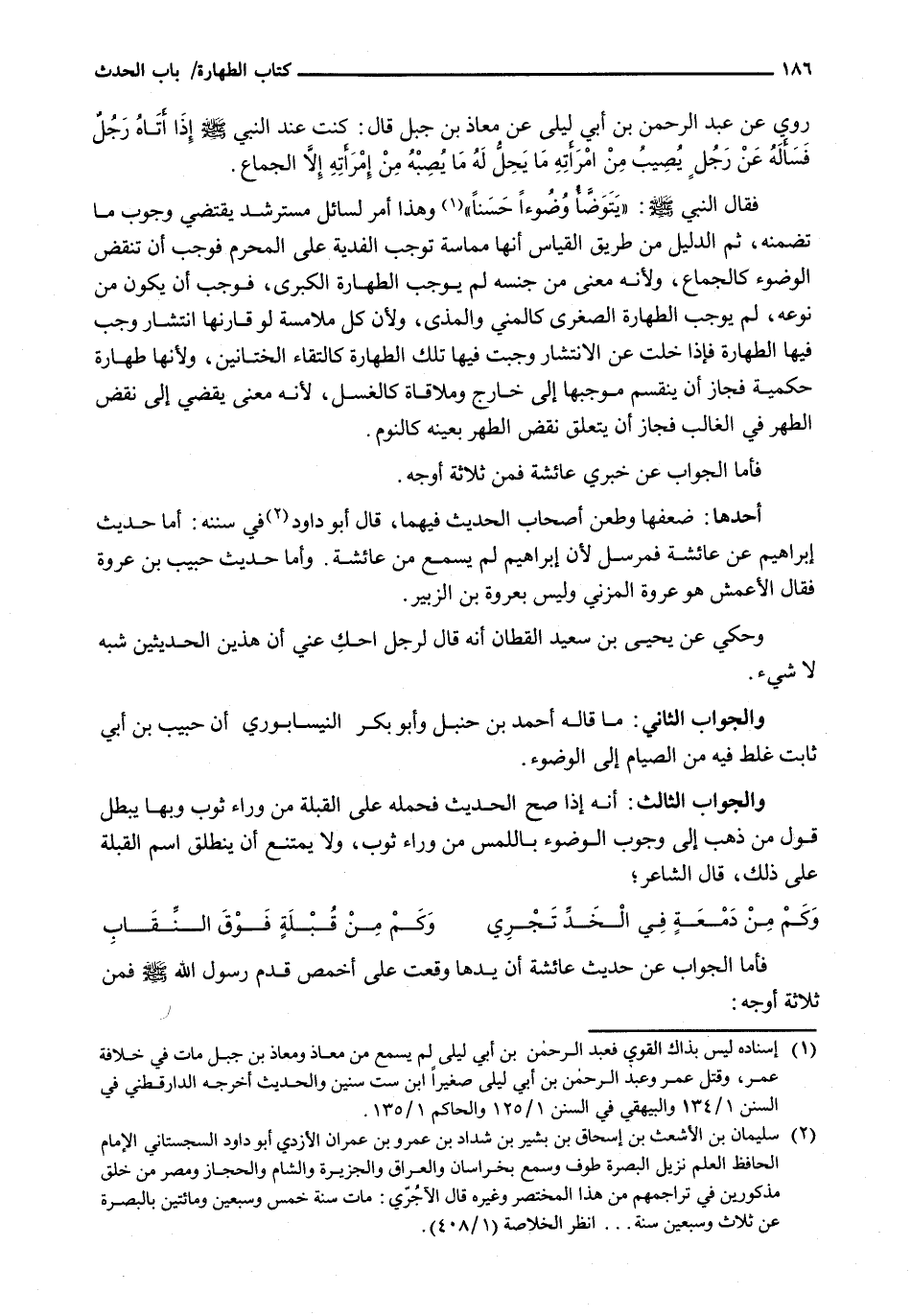أحدها: ضعفها وَطَعْنُ أَصْحَابِ الْحَدِيثِ فِيهِمَا، قَالَ أَبُو دَاوُدَ فِي سُنَنِهِ: أَمَّا حَدِيثُ إِبْرَاهِيمَ عَنْ عَائِشَةَ فَمُرْسَلٌ لِأَنَّ إِبْرَاهِيمَ لَمْ يَسْمَعْ مِنْ عَائِشَةَ. وَأَمَّا حَدِيثُ حَبِيبِ بْنِ عُرْوَةَ فَقَالَ الْأَعْمَشُ هُوَ عُرْوَةُ الْمُزَنِيُّ وَلَيْسَ بِعُرْوَةَ بْنِ الزُّبَيْرِ.