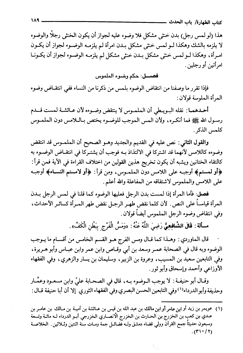: قال الشافعي رضي الله عنه: " ومس الفرج بِبَطْنِ الْكَفِّ ".