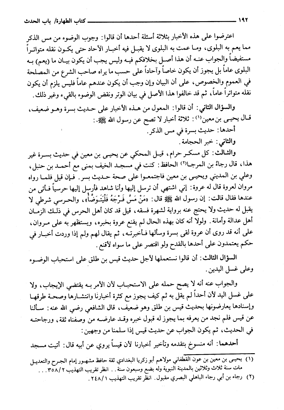 وَالسُّؤَالُ الثَّانِي: أَنْ قَالُوا: الْمُعَوَّلُ مِنْ هَذِهِ الْأَخْبَارِ عَلَى حَدِيثِ بُسْرَةَ وَهُوَ ضَعِيفٌ، قَالَ يَحْيَى بْنُ مَعِينٍ: ثَلَاثَةُ أَخْبَارٍ لَا تَصِحُّ عَنْ رَسُولِ اللَّهِ - صَلَّى اللَّهُ عَلَيْهِ وَسَلَّم َ -: