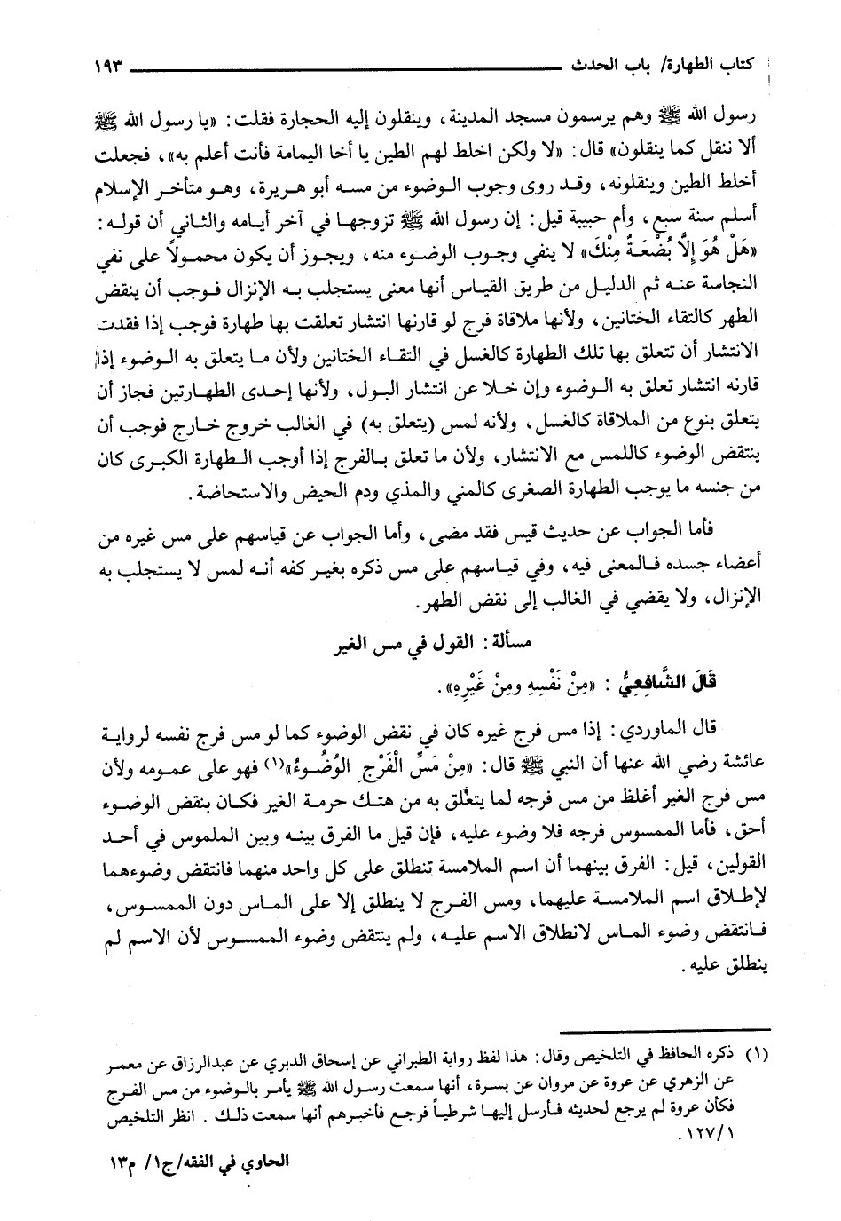 رسول الله - صَلَّى اللَّهُ عَلَيْهِ وَسَلَّم َ - وهم يرسمون مَسْجِدَ الْمَدِينَةِ، وَيَنْقُلُونَ إِلَيْهِ الْحِجَارَةَ فَقُلْتُ: " يَا رَسُولَ اللَّهِ - صَلَّى اللَّهُ عَلَيْهِ وَسَلَّم َ - أَلَا نَنْقُلُ كَمَا يَنْقُلُونَ " قَالَ: " لَا وَلَكِنِ اخْلِطْ لَهُمُ الطِّينَ يَا أَخَا الْيَمَامَةِ فَأَنْتَ أَعْلَمُ بِهِ "، فَجَعَلْتُ أَخْلِطُ الطِّينَ وَيَنْقُلُونَهُ، وَقَدْ رَوَى وُجُوبَ الْوُضُوءِ مِنْ مَسِّهِ أَبُو هُرَيْرَةَ، وَهُوَ مُتَأَخِّرُ الْإِسْلَامِ أَسْلَمَ سَنَةَ سَبْعٍ، وَأُمُّ حَبِيبَةَ قِيلَ: إِنَّ رَسُولَ اللَّهِ - صَلَّى اللَّهُ عَلَيْهِ وَسَلَّم َ - تَزَوَّجَهَا فِي آخِرِ أَيَّامِهِ وَالثَّانِي أَنَّ قَوْلَهُ: " هل هو إلا بضعةً منك " لا بنفي وجوب الوضوء عنه، وَيَجُوزُ أَنْ يَكُونَ مَحْمُولًا عَلَى نَفْيِ النَّجَاسَةِ عَنْهُ ثُمَّ الدَّلِيلُ مِنْ طَرِيقِ الْقِيَاسِ أَنَّهَا مَعْنًى يَسْتَجْلِبُ بِهِ الْإِنْزَالَ فَوَجَبَ أَنْ يَنْقُضَ الطُّهْرَ كَالْتِقَاءِ الْخِتَانَيْنِ، وَلِأَنَّهَا مُلَاقَاةُ فَرْجٍ لَوْ قَارَنَهَا انْتِشَارٌ تَعَلَّقَتْ بِهَا طَهَارَةٌ فَوَجَبَ إِذَا فَقَدَتِ الِانْتِشَارَ أَنْ تَتَعَلَّقَ بِهَا تِلْكَ الطَّهَارَةُ كَالْغُسْلِ فِي الْتِقَاءِ الْخِتَانَيْنِ وَلِأَنَّ مَا يَتَعَلَّقُ بِهِ الْوُضُوءُ إِذَا قَارَنَهُ انْتِشَارٌ تَعَلَّقَ بِهِ الوضوء وإن خلا عن انتشار البول، وَلِأَنَّهَا إِحْدَى الطَّهَارَتَيْنِ فَجَازَ أَنْ يَتَعَلَّقَ بِنَوْعٍ مِنَ الْمُلَاقَاةِ كَالْغُسْلِ، وَلِأَنَّهُ لَمْسٌ (يَتَعَلَّقُ بِهِ) فِي الْغَالِبِ خُرُوجُ خَارِجٍ فَوَجَبَ أَنْ يَنْتَقِضَ الْوُضُوءُ كَاللَّمْسِ مَعَ الِانْتِشَارِ، وَلِأَنَّ مَا تَعَلَّقَ بِالْفَرْجِ إِذَا أَوْجَبَ الطَّهَارَةَ الْكُبْرَى كَانَ مِنْ جِنْسِهِ مَا يُوجِبُ الطَّهَارَةَ الصُّغْرَى كَالْمَنِيِّ وَالْمَذْيِ وَدَمِ الْحَيْضِ وَالِاسْتِحَاضَةِ.