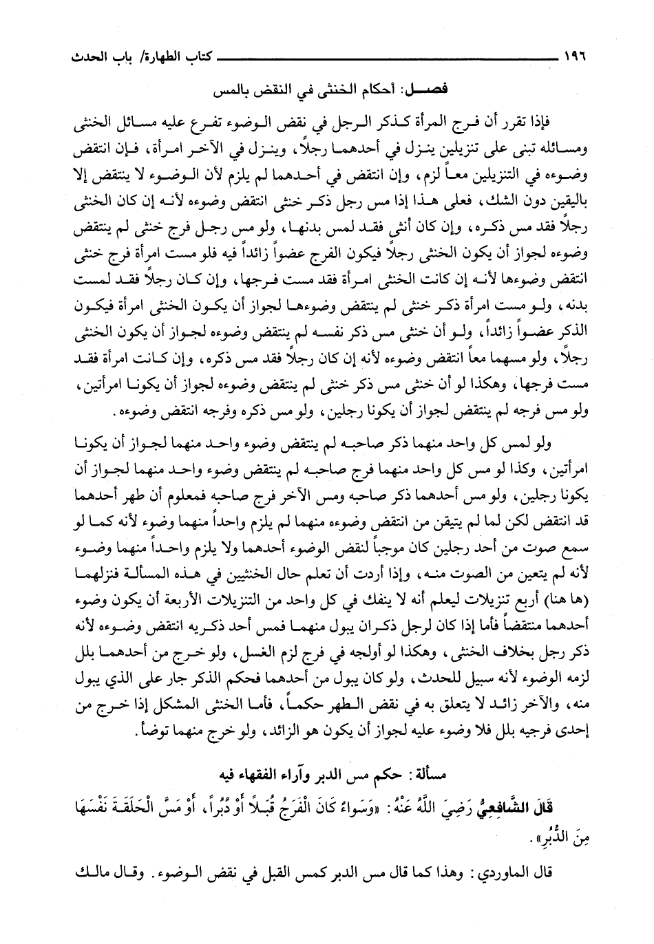 فَإِذَا تَقَرَّرَ أَنَّ فَرْجَ الْمَرْأَةِ كَذَكَرِ الرَّجُلِ فِي نَقْضِ الْوُضُوءِ تَفَرَّعَ عَلَيْهِ مَسَائِلُ الْخُنْثَى وَمَسَائِلُهُ تُبْنَى عَلَى تَنْزِيلَيْنِ يَنْزِلُ فِي أَحَدِهِمَا رجلاً، وينزل في الآخر امرأة، فإذا انْتَقَضَ وُضُوءُهُ فِي التَّنْزِيلَيْنِ مَعًا لَزِمَ، وَإِنِ انْتَقَضَ فِي أَحَدِهِمَا لَمْ يَلْزَمْ لِأَنَّ الْوُضُوءَ لَا يَنْتَقِضُ إِلَّا بِالْيَقِينِ دُونَ الشَّكِّ، فَعَلَى هَذَا إِذَا مَسَّ رَجُلٌ ذَكَرَ خُنْثَى انْتَقَضَ وُضُوءُهُ لِأَنَّهُ إِنْ كَانَ الْخُنْثَى رَجُلًا فَقَدْ مَسَّ ذَكَرَهُ، وَإِنْ كَانَ أُنْثَى فَقَدْ لَمَسَ بَدَنَهَا، وَلَوْ مَسَّ رَجُلٌ فَرْجَ خُنْثَى لَمْ يَنْتَقِضْ وُضُوءُهُ لِجَوَازِ أَنْ يَكُونَ الْخُنْثَى رَجُلًا فَيَكُونُ الْفَرْجُ عُضْوًا زَائِدًا فِيهِ فَلَوْ مَسَّتِ امْرَأَةٌ فَرْجَ خُنْثَى انْتَقَضَ وُضُوءُهَا لِأَنَّهُ إِنْ كَانَتِ الْخُنْثَى امْرَأَةً فَقَدْ مَسَّتْ فَرْجَهَا، وَإِنْ كَانَ رَجُلًا فَقَدْ لَمَسَتْ بَدَنَهُ، وَلَوْ مَسَّتِ امْرَأَةٌ ذَكَرَ خُنْثَى لَمْ يَنْتَقِضْ وُضُوءُهَا لِجَوَازِ أَنْ يَكُونَ الْخُنْثَى امْرَأَةً فَيَكُونُ الذَّكَرُ عُضْوًا زَائِدًا، وَلَوْ أَنَّ خُنْثَى مَسَّ ذَكَرَ نَفْسِهِ لَمْ يَنْتَقِضْ وُضُوءُهُ لِجَوَازِ أَنْ يَكُونَ الْخُنْثَى رَجُلًا، وَلَوْ مَسَّهُمَا مَعًا انْتَقَضَ وُضُوءُهُ لِأَنَّهُ إِنْ كَانَ رَجُلًا فَقَدْ مَسَّ ذَكَرَهُ، وَإِنْ كَانَتِ امْرَأَةً فَقَدْ مَسَّتْ فَرْجَهَا، وَهَكَذَا لَوْ أَنَّ خُنْثَى مَسَّ ذَكَرَ خُنْثَى لَمْ يَنْتَقِضْ وُضُوءُهُ لِجَوَازِ أَنْ يَكُونَا امْرَأَتَيْنِ، وَلَوْ مَسَّ فَرْجَهُ لَمْ يَنْتَقِضْ لِجَوَازِ أَنْ يَكُونَا رَجُلَيْنِ، وَلَوْ مَسَّ ذَكَرَهَ وَفَرْجَهُ انْتَقَضَ وُضُوءُهُ.