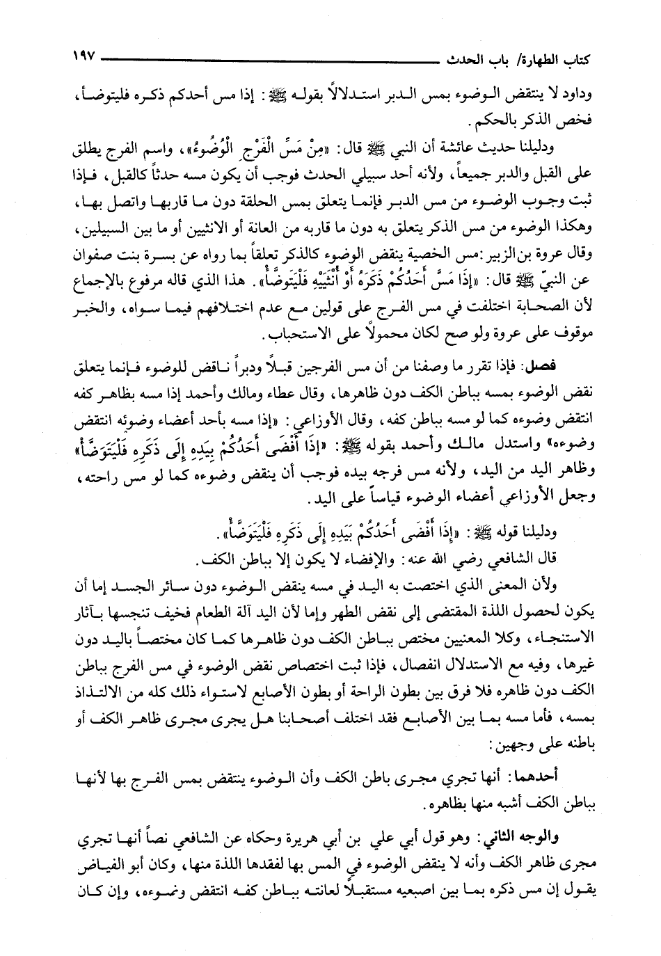 : فَإِذَا تَقَرَّرَ مَا وَصَفْنَا مِنْ أَنَّ مَسَّ الْفَرْجَيْنِ قُبُلًا وَدُبُرًا نَاقِضٌ لِلْوُضُوءِ فَإِنَّمَا يَتَعَلَّقُ نَقْضُ الْوُضُوءِ بِمَسِّهِ بِبَاطِنِ الْكَفِّ دُونَ ظَاهِرِهَا، وَقَالَ عَطَاءٌ وَمَالِكٌ وَأَحْمَدُ إِذَا مَسَّهُ بِظَاهِرِ كَفِّهِ انْتَقَضَ وُضُوءُهُ كَمَا لَوْ مَسَّهُ بِبَاطِنِ كَفِّهِ، وَقَالَ الْأَوْزَاعِيُّ: " إِذَا مَسَّهُ بِأَحَدِ أَعْضَاءِ وُضُوئِهِ انْتَقَضَ وُضُوءُهُ " وَاسْتَدَلَّ مَالِكٌ وأحمد بقوله - صَلَّى اللَّهُ عَلَيْهِ وَسَلَّم َ -: " إذا أفضى أحدكم بيده إلى ذكره فليتوضأ " وَظَاهِرُ الْيَدِ مِنَ الْيَدِ، وَلِأَنَّهُ مَسَّ فَرْجَهُ بِيَدِهِ فَوَجَبَ أَنْ يَنْقُضَ وُضُوءَهُ كَمَا لَوْ مَسَّ رَاحَتَهُ، وَجَعَلَ الْأَوْزَاعِيُّ أَعْضَاءَ الْوُضُوءِ قِيَاسًا عَلَى الْيَدِ.