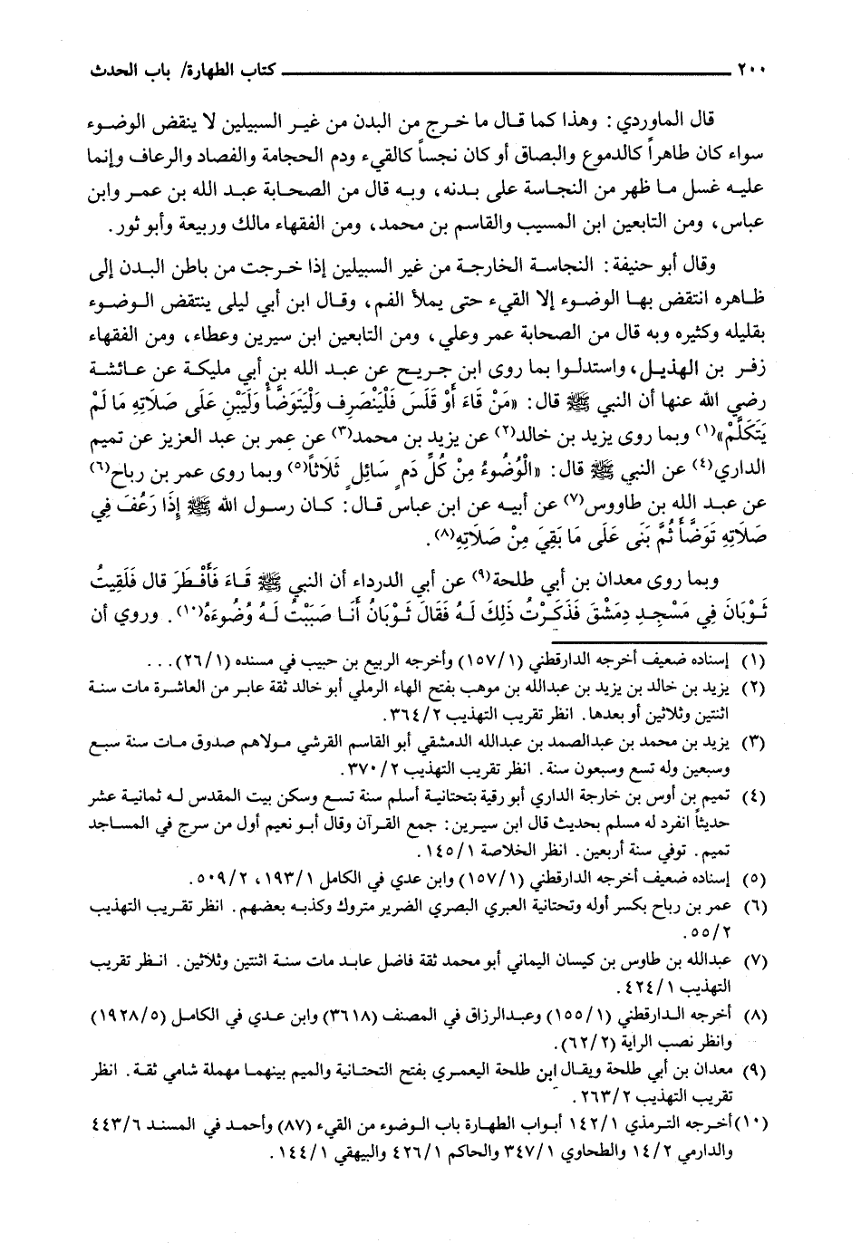 قَالَ الْمَاوَرْدِيُّ: وَهَذَا كَمَا قَالَ مَا خَرَجَ مِنَ الْبَدَنِ مِنْ غَيْرِ السَّبِيلَيْنِ لَا يَنْقُضُ الْوُضُوءَ سَوَاءٌ كَانَ طَاهِرًا كَالدُّمُوعِ وَالْبُصَاقِ أَوْ كَانَ نَجِسًا كَالْقَيْءِ وَدَمِ الْحِجَامَةِ وَالْفِصَادِ وَالرُّعَافِ وَإِنَّمَا عَلَيْهِ غَسْلُ مَا ظَهَرَ مِنَ النَّجَاسَةِ عَلَى بَدَنِهِ، وَبِهِ قَالَ مِنَ الصَّحَابَةِ عَبْدُ اللَّهِ بْنُ عُمَرَ وَابْنُ عَبَّاسٍ، وَمِنَ التَّابِعِينَ ابْنُ الْمُسَيَّبِ وَالْقَاسِمُ بْنُ مُحَمَّدٍ، وَمِنَ الْفُقَهَاءِ مَالِكٌ وَرَبِيعَةُ وَأَبُو ثَوْرٍ.