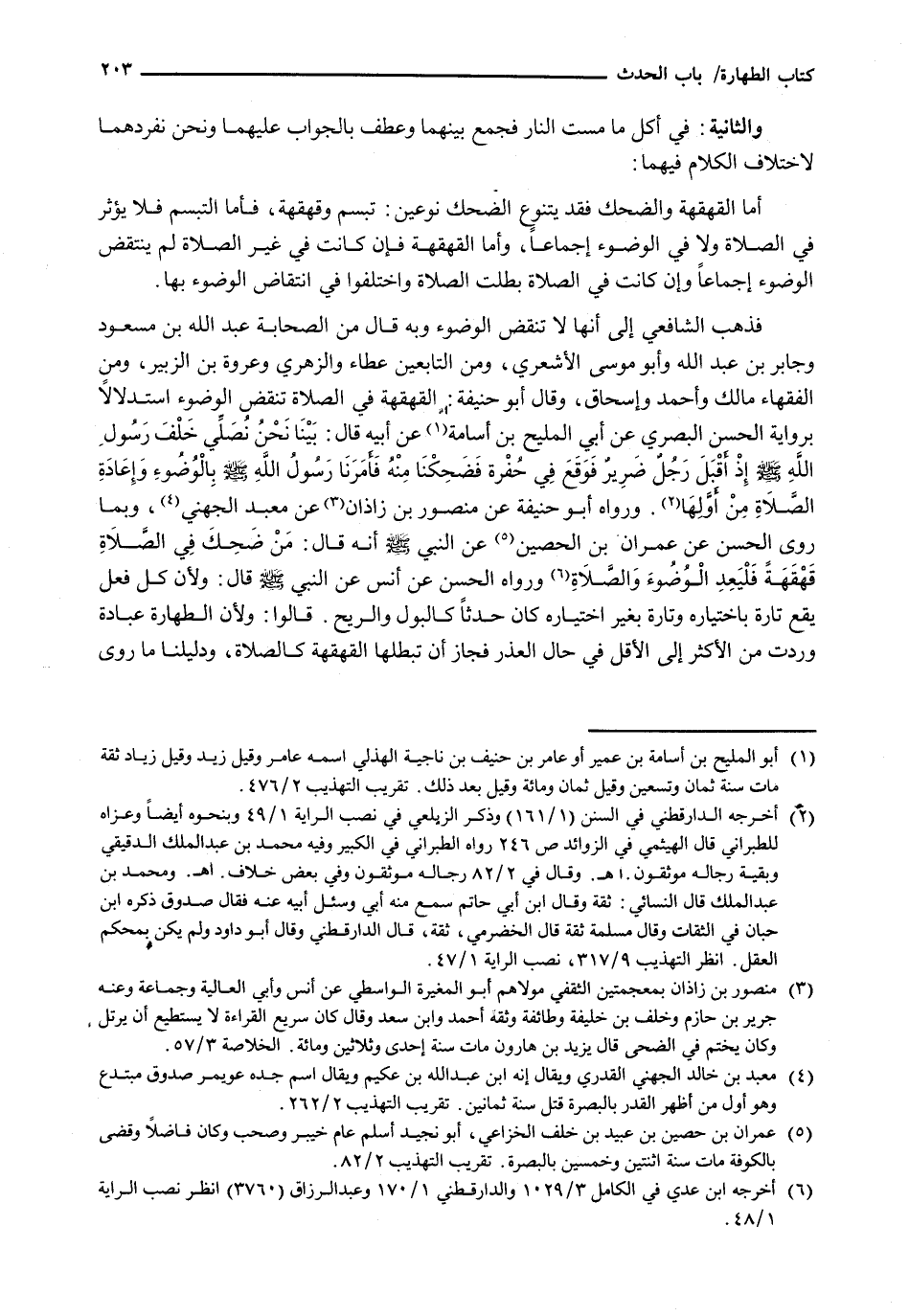 أَمَّا الْقَهْقَهَةُ وَالضَّحِكُ فَقَدْ يَتَنَوَّعُ الضَّحِكُ نَوْعَيْنِ: تَبَسُّمٌ وَقَهْقَهَةٌ، فَأَمَّا التَّبَسُّمُ فَلَا يُؤَثِّرُ فِي الصَّلَاةِ وَلَا فِي الْوُضُوءِ إِجْمَاعًا، وَأَمَّا الْقَهْقَهَةُ فَإِنْ كَانَتْ فِي غَيْرِ الصَّلَاةِ لَمْ يَنْتَقِضِ الْوُضُوءُ إِجْمَاعًا وَإِنْ كَانَتْ فِي الصَّلَاةِ بَطَلَتِ الصَّلَاةُ وَاخْتَلَفُوا فِي انْتِقَاضِ الْوُضُوءِ بِهَا. فَذَهَبَ الشَّافِعِيُّ إِلَى أَنَّهَا لَا تَنْقُضُ الْوُضُوءَ وَبِهِ قَالَ مِنَ الصَّحَابَةِ عَبْدُ اللَّهِ بْنُ مَسْعُودٍ وَجَابِرُ بْنُ عَبْدِ اللَّهِ وَأَبُو مُوسَى الْأَشْعَرِيُّ، وَمِنَ التَّابِعِينَ عَطَاءٌ وَالزُّهْرِيُّ وَعُرْوَةُ بْنُ الزُّبَيْرِ، وَمِنَ الْفُقَهَاءِ مَالِكٌ وَأَحْمَدُ وَإِسْحَاقُ، وَقَالَ أبو حنيفة: الْقَهْقَهَةُ فِي الصَّلَاةِ تَنْقُضُ الْوُضُوءَ اسْتِدْلَالًا بِرِوَايَةِ الْحَسَنِ الْبَصْرِيِّ عَنْ أَبِي الْمَلِيحِ بْنِ أُسَامَةَ عَنْ أَبِيهِ قَالَ: بَيْنَا نَحْنُ نُصَلِّي خَلْفَ رَسُولِ اللَّهِ - صَلَّى اللَّهُ عَلَيْهِ وَسَلَّم َ - إِذْ أَقْبَلَ رجلٌ ضريرٌ فَوَقَعَ فِي حُفْرَةٍ فَضَحِكْنَا مِنْهُ فَأَمَرَنَا رَسُولُ اللَّهِ - صَلَّى اللَّهُ عَلَيْهِ وَسَلَّم َ - بِالْوُضُوءِ وَإِعَادَةِ الصَّلَاةِ مِنْ أَوَّلِهَا. وَرَوَاهُ أبو حنيفة عن منصور بن زاذان عَنْ مَعْبَدٍ الْجُهَنِيِّ، وَبِمَا رَوَى الْحَسَنُ عَنْ عِمْرَانَ بْنِ الْحُصَيْنِ عَنِ النَّبِيِّ - صَلَّى اللَّهُ عَلَيْهِ وَسَلَّم َ - أَنَّهُ قَالَ: مَنْ ضَحِكَ فِي الصَّلَاةِ قَهْقَهَةً فَلْيُعِدِ الْوُضُوءَ وَالصَّلَاةَ وَرَوَاهُ الْحَسَنُ عَنْ أَنَسٍ عن النبي - صَلَّى اللَّهُ عَلَيْهِ وَسَلَّم َ - قَالَ: وَلِأَنَّ كُلَّ فِعْلٍ يَقَعُ تَارَةً بِاخْتِيَارِهِ وَتَارَةً بِغَيْرِ اخْتِيَارِهِ كَانَ حَدَثًا كَالْبَوْلِ وَالرِّيحِ. قَالُوا: وَلِأَنَّ الطَّهَارَةَ عِبَادَةٌ وَرَدَتْ مِنَ الْأَكْثَرِ إِلَى الْأَقَلِّ فِي حَالِ الْعُذْرِ فَجَازَ أَنْ تُبْطِلَهَا الْقَهْقَهَةُ كَالصَّلَاةِ، وَدَلِيلُنَا مَا رَوَى