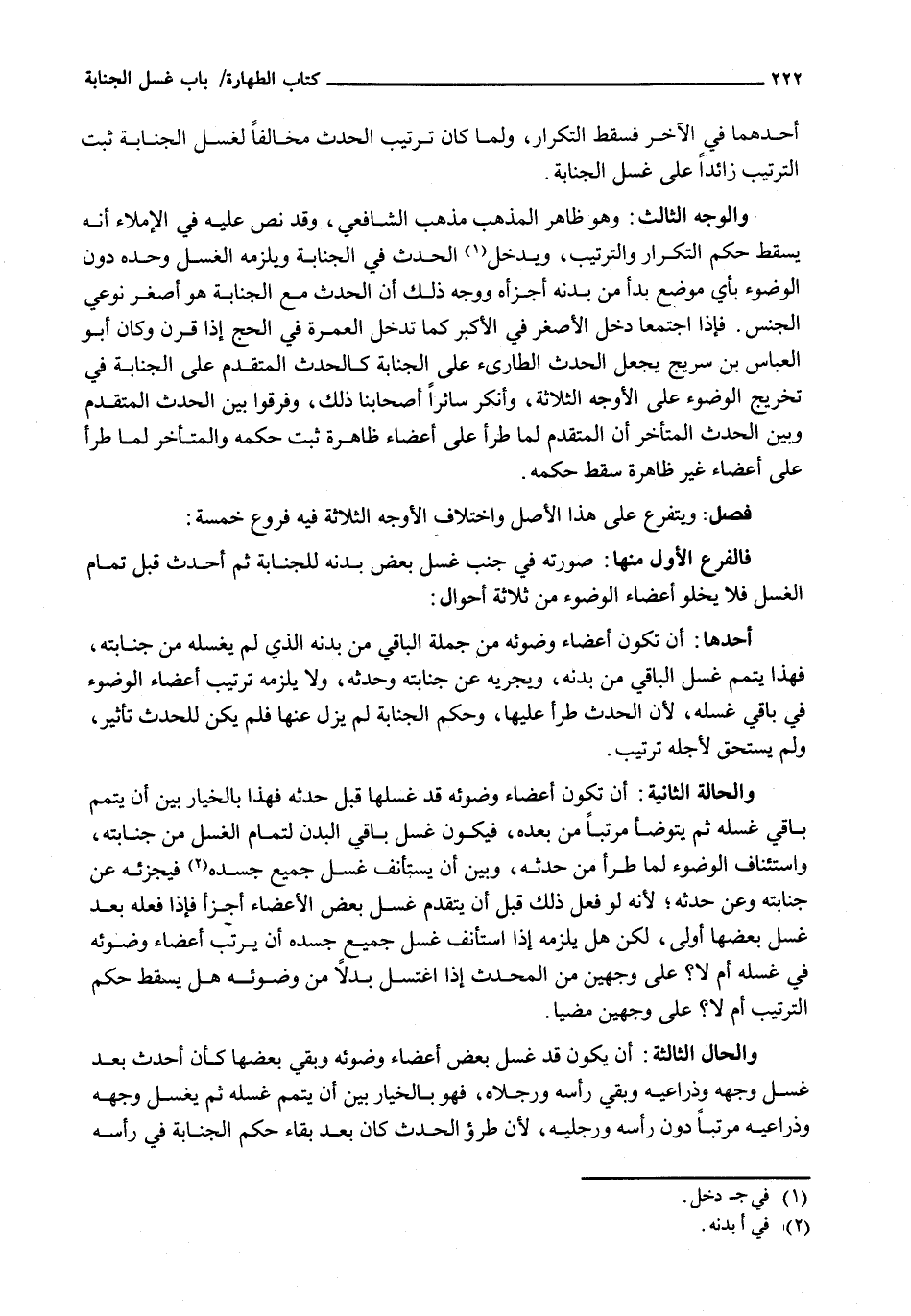 وَالْوَجْهُ الثَّالِثُ: وَهُوَ ظَاهِرُ الْمَذْهَبِ مَذْهَبِ الشَّافِعِيِّ، وَقَدْ نَصَّ عَلَيْهِ فِي الْإِمْلَاءِ أَنَّهُ يَسْقُطُ حُكْمُ التَّكْرَارِ وَالتَّرْتِيبِ، وَيَدْخُلُ الْحَدَثُ فِي الْجَنَابَةِ وَيَلْزَمُهُ الْغُسْلُ وَحْدَهُ دُونَ الْوُضُوءِ بِأَيِّ مَوْضِعٍ بَدَأَ مِنْ بَدَنِهِ أَجْزَأَهُ وَوَجْهُ ذَلِكَ أَنَّ الْحَدَثَ مَعَ الْجَنَابَةِ هُوَ أَصْغَرُ نَوْعَيِ الْجِنْسِ. فَإِذَا اجْتَمَعَا دَخَلَ الْأَصْغَرُ فِي الْأَكْبَرِ كَمَا تَدْخُلُ الْعُمْرَةُ فِي الْحَجِّ إِذَا قَرَنَ وَكَانَ أَبُو الْعَبَّاسِ بْنُ سُرَيْجٍ يَجْعَلُ الْحَدَثَ الطَّارِئَ عَلَى الْجَنَابَةِ كَالْحَدَثِ الْمُتَقَدِّمِ عَلَى الْجَنَابَةِ فِي تَخْرِيجِ الْوُضُوءِ عَلَى الأوجه الثلاثة، وأنكر سائراً أَصْحَابِنَا ذَلِكَ، وَفَرَّقُوا بَيْنَ الْحَدَثِ الْمُتَقَدِّمِ وَبَيْنَ الْحَدَثِ الْمُتَأَخِّرِ أَنَّ الْمُتَقَدِّمَ لَمَّا طَرَأَ عَلَى أَعْضَاءٍ ظَاهِرَةٍ ثَبَتَ حُكْمُهُ وَالْمُتَأَخِّرُ لَمَّا طَرَأَ عَلَى أَعْضَاءٍ غَيْرِ ظَاهِرَةٍ سَقَطَ حُكْمُهُ.