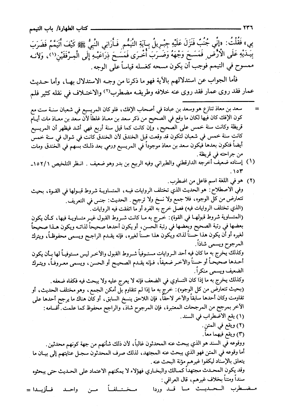 بِي " فَقُلْتُ: " إِنِّي جنبٌ فَنَزَلَ عَلَيْهِ جِبْرِيلُ بِآيَةِ التَّيَمُّمِ فَأَرَانِي النَّبِيُّ - صَلَّى اللَّهُ عَلَيْهِ وَسَلَّم َ - كَيْفَ أَتَيَمَّمُ فَضَرَبَ بِيَدَيْهِ عَلَى الْأَرْضِ فَمَسَحَ وَجْهَهُ وَضَرَبَ أُخْرَى فَمَسَحَ ذِرَاعَيْهِ إِلَى الْمِرْفَقَيْنِ، وَلِأَنَّهُ مَمْسُوحٌ فِي التَّيَمُّمِ فَوَجَبَ أَنْ يَكُونَ مَسْحُهُ كَغَسْلِهِ قِيَاسًا عَلَى الْوَجْهِ.
