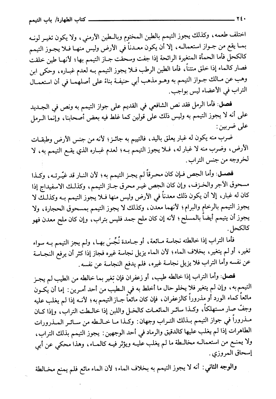 : فَأَمَّا الرَّمْلُ فَقَدْ نَصَّ الشَّافِعِيُّ فِي الْقَدِيمِ عَلَى جَوَازِ التَّيَمُّمِ بِهِ وَنَصَّ فِي الْجَدِيدِ عَلَى أَنَّهُ لَا يَجُوزُ التَّيَمُّمُ بِهِ وَلَيْسَ ذَلِكَ عَلَى قَوْلَيْنِ كَمَا غَلِطَ فِيهِ بَعْضُ أَصْحَابِنَا، وَإِنَّمَا الرَّمْلُ عَلَى ضَرْبَيْنِ: