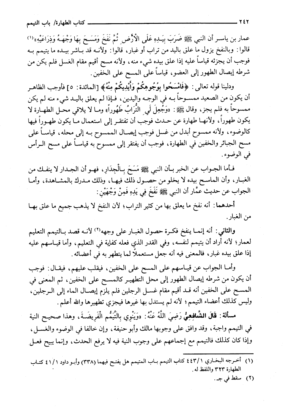 فَأَمَّا الْجَوَابُ عَنِ الْخَبَرِ بِأَنَّ النَّبِيَّ - صَلَّى اللَّهُ عَلَيْهِ وَسَلَّم َ - مَسَحَ بِالْجِدَارِ، فَهُوَ أَنَّ الْجِدَارَ لَا يَنْفَكُّ مِنَ الْغُبَارِ، وَأَنَّ الْمَاسِحَ بِيَدِهِ لَا يَخْلُو مِنْ حُصُولِ ذَلِكَ فِيهَا، وَذَلِكَ مُدْرَكٌ بِالْمُشَاهَدَةِ، وَأَمَّا الْجَوَابُ عَنْ حَدِيثِ عَمَّارٍ أَنَّ النَّبِيَّ - صَلَّى اللَّهُ عَلَيْهِ وَسَلَّم َ - نَفَخَ فِي يَدِهِ فَمِنْ وَجْهَيْنِ: