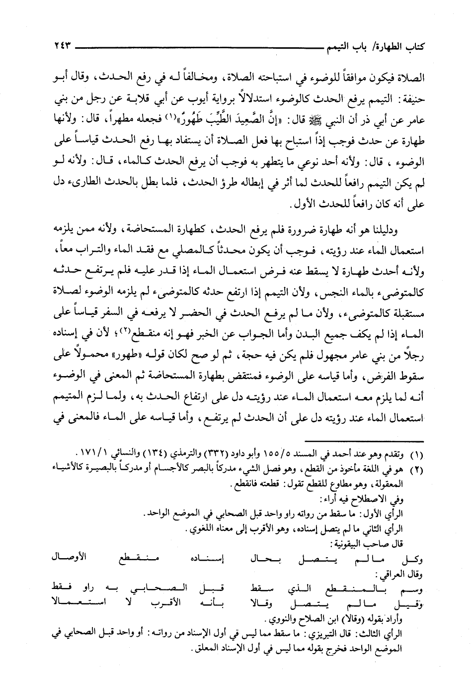 الصَّلَاةِ فَيَكُونُ مُوَافِقًا لِلْوُضُوءِ فِي اسْتِبَاحَتِهِ الصَّلَاةَ، وَمُخَالِفًا لَهُ فِي رَفْعِ الْحَدَثِ، وَقَالَ أبو حنيفة: التَّيَمُّمُ يَرْفَعُ الْحَدَثَ كَالْوُضُوءِ اسْتِدْلَالًا بِرِوَايَةِ أيوب عن أبي قلابة عن رجل من بَنِي عَامِرٍ عَنْ أَبِي ذَرٍّ أَنَّ النَّبِيَّ - صَلَّى اللَّهُ عَلَيْهِ وَسَلَّم َ - قَالَ: " إِنَّ الصَّعِيدَ الطَّيِّبَ طهورٌ " فَجَعَلَهُ مُطَهِّرًا، قَالَ: وَلِأَنَّهَا طَهَارَةٌ عَنْ حَدَثٍ فَوَجَبَ إِذَا اسْتَبَاحَ بِهَا فِعْلَ الصَّلَاةِ أَنْ يُسْتَفَادَ بِهَا رَفْعُ الْحَدَثِ قِيَاسًا عَلَى الْوُضُوءِ، قَالَ: وَلِأَنَّهُ أَحَدُ نَوْعَيْ مَا يُتَطَهَّرُ بِهِ فَوَجَبَ أَنْ يَرْفَعَ الْحَدَثَ كَالْمَاءِ، قَالَ: وَلِأَنَّهُ لَوْ لَمْ يَكُنِ التَّيَمُّمُ رَافِعًا لِلْحَدَثِ لَمَا أَثَّرَ فِي إبطاله طرؤ الْحَدَثِ، فَلَمَّا بَطَلَ بِالْحَدَثِ الطَّارِئِ دَلَّ عَلَى أَنَّهُ كَانَ رَافِعًا لِلْحَدَثِ الْأَوَّلِ.