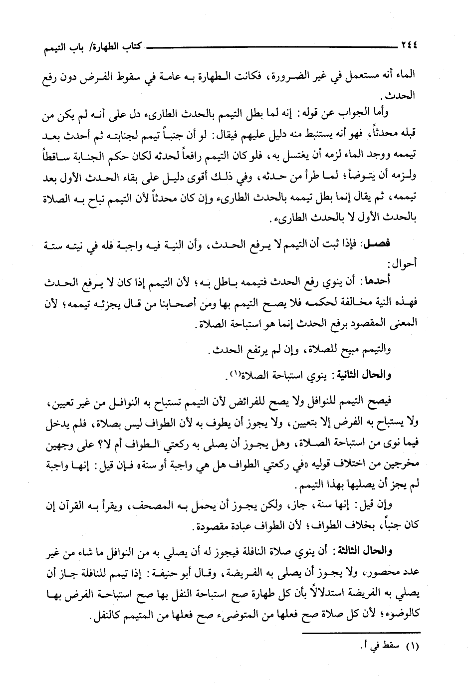 وَالْحَالُ الثَّالِثَةُ: أَنْ يَنْوِيَ صَلَاةَ النَّافِلَةِ فَيَجُوزُ لَهُ أَنْ يُصَلِّيَ بِهِ مِنَ النَّوَافِلِ مَا شَاءَ مِنْ غَيْرِ عَدَدٍ مَحْصُورٍ، وَلَا يَجُوزُ أَنْ يُصَلِّي بِهِ الْفَرِيضَةَ، وَقَالَ أبو حنيفة: إِذَا تَيَمَّمَ لِلنَّافِلَةِ جَازَ أَنْ يُصَلِّيَ بِهِ الْفَرِيضَةَ اسْتِدْلَالًا بِأَنَّ كُلَّ طَهَارَةٍ صَحَّ اسْتِبَاحَةُ النَّفْلِ بِهَا صَحَّ اسْتِبَاحَةُ الْفَرْضِ بِهَا كَالْوُضُوءِ؛ لِأَنَّ كُلَّ صَلَاةٍ صَحَّ فِعْلُهَا مِنَ الْمُتَوَضِّئِ صَحَّ فِعْلُهَا مِنَ الْمُتَيَمِّمِ كَالنَّفْلِ.
