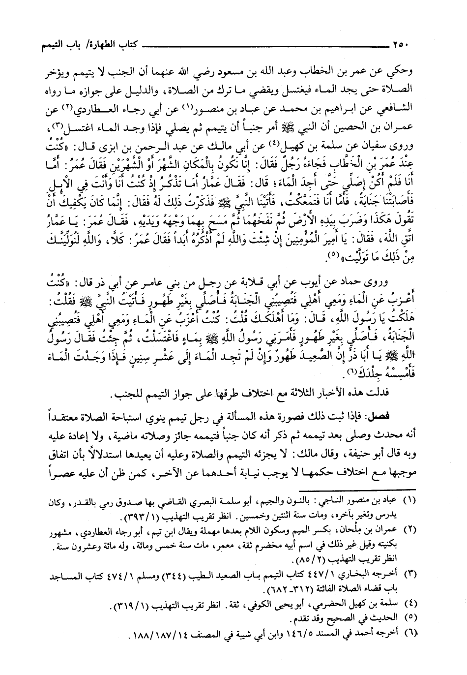 وَحُكِيَ عَنْ عُمَرَ بْنِ الْخَطَّابِ وَعَبْدِ اللَّهِ بْنِ مَسْعُودٍ رَضِيَ اللَّهُ عَنْهُمَا أَنَّ الْجُنُبَ لَا يَتَيَمَّمُ وَيُؤَخِّرُ الصَّلَاةَ حَتَّى يَجِدَ الْمَاءَ فَيَغْتَسِلَ وَيَقْضِي مَا تَرَكَ مِنَ الصَّلَاةِ، وَالدَّلِيلُ عَلَى جَوَازِهِ مَا رَوَاهُ الشَّافِعِيُّ عَنْ إِبْرَاهِيمَ بْنِ مُحَمَّدٍ عَنْ عِبَادِ بْنِ مَنْصُورٍ عَنْ أَبِي رَجَاءٍ الْعَطَارِدِيِّ عَنْ عِمْرَانَ بْنِ الْحُصَيْنِ أَنَّ النَّبِيَّ - صَلَّى اللَّهُ عَلَيْهِ وَسَلَّم َ - أَمَرَ جُنُبًا أَنْ يَتَيَمَّمَ ثُمَّ يُصَلِّي فَإِذَا وَجَدَ الْمَاءَ اغْتَسَلَ، وَرَوَى سُفْيَانُ عَنْ سَلَمَةَ بْنِ كُهَيْلٍ عَنْ أَبِي مَالِكٍ عَنْ عَبْدِ الرَّحْمَنِ بْنِ أَبْزَى قَالَ: " كُنْتُ عِنْدَ عُمَرَ بْنِ الْخَطَّابِ فَجَاءَهُ رجلٌ فَقَالَ: إِنَّا نَكُونُ بِالْمَكَانِ الشَهْرَ أَوِ الشَّهْرَيْنِ فَقَالَ عُمَرُ: أَمَّا أَنَا فَلَمْ أَكُنْ أُصَلِّي حَتَّى أَجِدَ الْمَاءَ؛ قَالَ: فَقَالَ عَمَّارُ أَمَا تَذْكُرُ إِذْ كُنْتُ أَنَا وَأَنْتَ فِي الْإِبِلِ فَأَصَابَتْنَا جنابةٌ، فَأَمَّا أَنَا فَتَمَعَّكْتُ، فَأَتَيْنَا النَّبِيَّ - صَلَّى اللَّهُ عَلَيْهِ وَسَلَّم َ - فَذَكَرْتُ ذَلِكَ لَهُ فَقَالَ: إِنَّمَا كَانَ يَكْفِيكَ أَنْ تَقُولَ هَكَذَا وَضَرَبَ بِيَدِهِ الْأَرْضَ ثُمَّ نَفَخَهُمَا ثُمَّ مَسَحَ بِهِمَا وَجْهَهُ وَيَدَيْهِ، فَقَالَ عُمَرُ: يَا عَمَّارُ اتَّقِ اللَّهَ، فَقَالَ: يَا أَمِيرَ الْمُؤْمِنِينَ إِنْ شِئْتَ وَاللَّهِ لَمْ أَذْكُرْهُ أَبَدًا فَقَالَ عُمَرُ: كَلَّا، وَاللَّهِ لَنُوَلِّيَنَّكَ مِنْ ذَلِكَ مَا تَوَلَّيْتَ ".