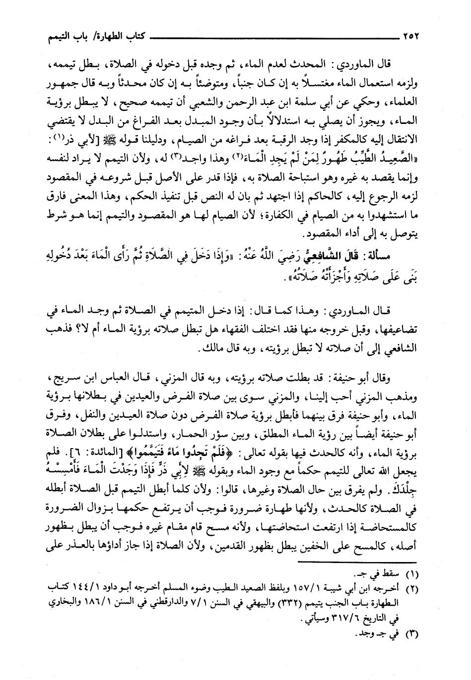 قَالَ الْمَاوَرْدِيُّ: وَهَذَا كَمَا قَالَ: إِذَا دَخَلَ الْمُتَيَمِّمُ فِي الصَّلَاةِ ثُمَّ وَجَدَ الْمَاءَ فِي تَضَاعِيفِهَا، وَقَبْلَ خُرُوجِهِ مِنْهَا فَقَدِ اخْتَلَفَ الْفُقَهَاءُ هَلْ تَبْطُلُ صَلَاتُهُ بِرُؤْيَةِ الْمَاءِ أَمْ لَا؟ فَذَهَبَ الشَّافِعِيُّ إِلَى أَنَّ صَلَاتَهُ لَا تَبْطُلُ بِرُؤْيَتِهِ، وَبِهِ قَالَ مَالِكٌ.
