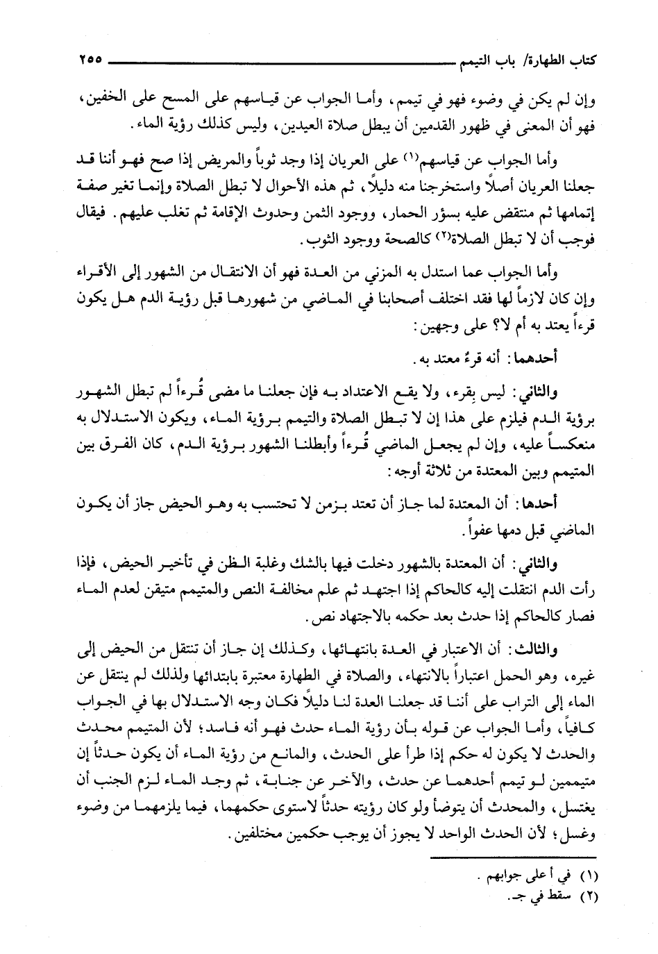 وَالثَّالِثُ: أَنَّ الِاعْتِبَارَ فِي الْعِدَّةِ بِانْتِهَائِهَا، وَكَذَلِكَ إِنْ جَازَ أَنْ تَنْتَقِلَ مِنَ الْحَيْضِ إِلَى غَيْرِهِ، وَهُوَ الْحَمْلُ اعْتِبَارًا بِالِانْتِهَاءِ، وَالصَّلَاةُ فِي الطَّهَارَةِ مُعْتَبَرَةٌ بِابْتِدَائِهَا وَلِذَلِكَ لَمْ يُنْتَقَلْ عَنِ الْمَاءِ إِلَى التُّرَابِ عَلَى أَنَّنَا قَدْ جَعَلْنَا الْعِدَّةَ لَنَا دَلِيلًا فَكَانَ وَجْهُ الِاسْتِدْلَالِ بِهَا فِي الْجَوَابِ كَافِيًا، وَأَمَّا الْجَوَابُ عَنْ قَوْلِهِ بِأَنَّ رُؤْيَةَ الْمَاءِ حَدَثٌ فَهُوَ أَنَّهُ فَاسِدٌ؛ لِأَنَّ الْمُتَيَمِّمَ مُحْدِثٌ وَالْحَدَثُ لَا يَكُونُ لَهُ حُكْمٌ إِذَا طَرَأَ عَلَى الْحَدَثِ، وَالْمَانِعُ مِنْ رُؤْيَةِ الْمَاءِ أَنْ يَكُونَ حَدَثًا إِنَّ مُتَيَمِّمَيْنِ لَوْ تَيَمَّمَ أَحَدُهُمَا عَنْ حَدَثٍ، وَالْآخَرُ عَنْ جَنَابَةٍ، ثُمَّ وَجَدَ الْمَاءَ لَزِمَ الْجُنُبَ أَنْ يَغْتَسِلَ، وَالْمُحْدِثَ أَنْ يَتَوَضَّأَ وَلَوْ كَانَ رُؤْيَتُهُ حَدَثًا لَاسْتَوَى حُكْمُهُمَا، فِيمَا يَلْزَمُهُمَا مِنْ وُضُوءٍ وَغَسْلٍ؛ لِأَنَّ الْحَدَثَ الْوَاحِدَ لَا يَجُوزُ أَنْ يُوجِبَ حُكْمَيْنِ مُخْتَلِفَيْنِ.
