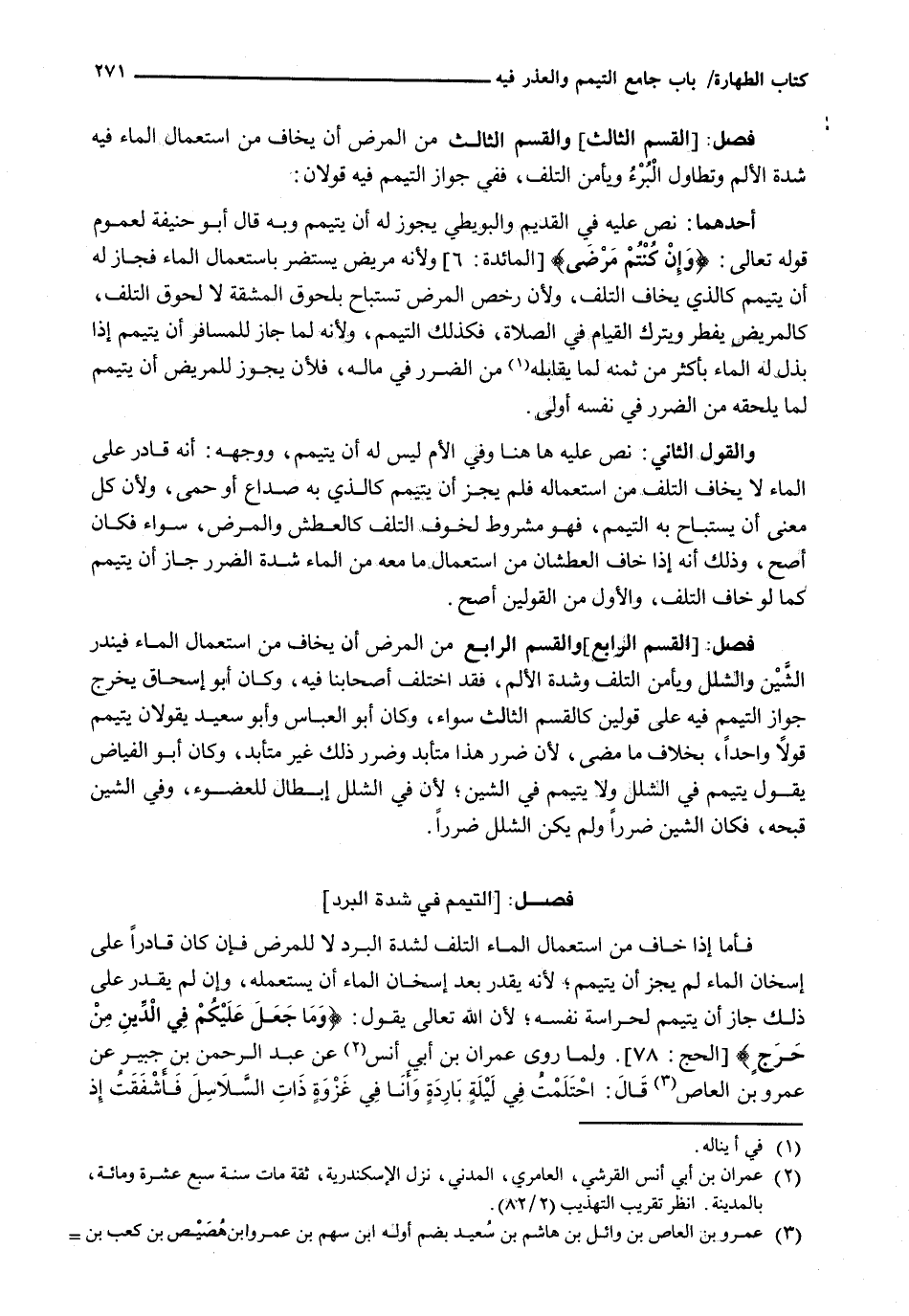 : [القسم الثالث] وَالْقِسْمُ الثَّالِثُ مِنَ الْمَرَضِ أَنْ يَخَافَ مِنِ اسْتِعْمَالِ الْمَاءِ فِيهِ شِدَّةَ الْأَلَمِ وَتَطَاوُلَ الْبُرْءِ وَيَأْمَنَ التَّلَفَ، فَفِي جَوَازِ التَّيَمُّمِ فِيهِ قَوْلَانِ: