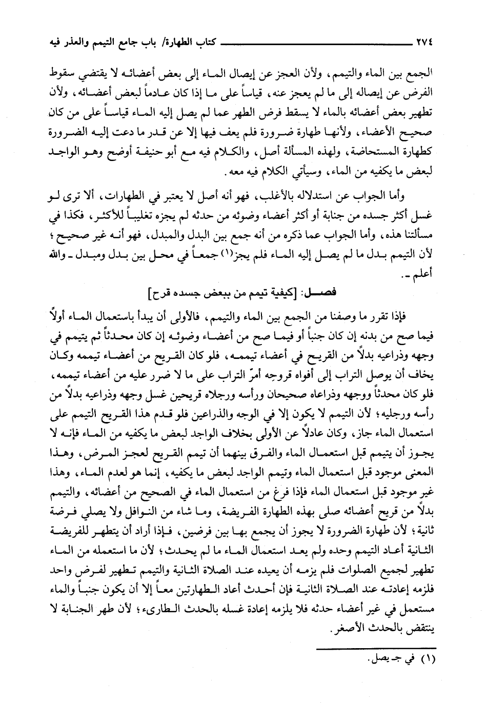 الْجَمْعِ بَيْنَ الْمَاءِ وَالتَّيَمُّمِ، وَلِأَنَّ الْعَجْزَ عَنْ إِيصَالِ الْمَاءِ إِلَى بَعْضِ أَعْضَائِهِ لَا يَقْتَضِي سُقُوطَ الْفَرْضِ عَنْ إِيصَالِهِ إِلَى مَا لَمْ يَعْجِزْ عَنْهُ، قِيَاسًا عَلَى مَا إِذَا كَانَ عَادِمًا لِبَعْضِ أَعْضَائِهِ، وَلِأَنَّ تَطْهِيرَ بَعْضِ أَعْضَائِهِ بِالْمَاءِ لَا يُسْقِطُ فَرْضَ الطُّهْرِ عَمَّا لَمْ يَصِلْ إِلَيْهِ الْمَاءُ قِيَاسًا عَلَى مَنْ كَانَ صَحِيحَ الْأَعْضَاءِ، وَلِأَنَّهَا طَهَارَةُ ضَرُورَةٍ فَلَمْ يُعْفَ فِيهَا إِلَّا عَنْ قَدْرِ مَا دَعَتْ إِلَيْهِ الضَّرُورَةُ كَطَهَارَةِ الْمُسْتَحَاضَةِ، وَلِهَذِهِ الْمَسْأَلَةِ أَصْلٌ، والكلام فيه مع أبو حنيفة أَوْضَحُ وَهُوَ الْوَاجِدُ لِبَعْضِ مَا يَكْفِيهِ مِنَ الْمَاءِ، وَسَيَأْتِي الْكَلَامُ فِيهِ مَعَهُ.