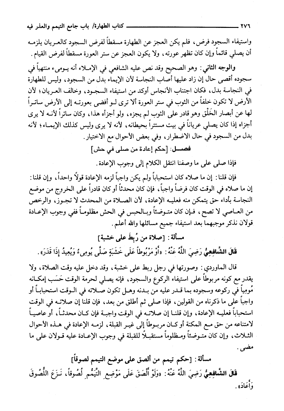 وَاسْتِيفَاءُ السُّجُودِ فَرْضٌ، فَلَمْ يَكُنِ الْعَجْزُ عَنِ الطَّهَارَةِ مُسْقِطًا لِفَرْضِ السُّجُودِ كَالْعُرْيَانِ يَلْزَمُهُ أَنْ يُصَلِّيَ قَائِمًا وَإِنْ كَانَ تَظْهَرُ عَوْرَتُهُ، وَلَا يَكُونُ الْعَجْزُ عَنْ سَتْرِ الْعَوْرَةِ مُسْقِطًا لِفَرْضِ الْقِيَامِ.