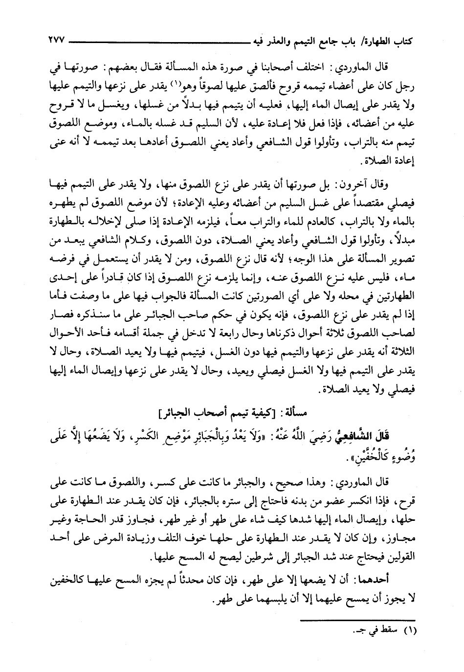 قَالَ الْمَاوَرْدِيُّ: وَهَذَا صَحِيحٌ، وَالْجَبَائِرُ مَا كَانَتْ عَلَى كَسْرٍ، وَاللُّصُوقُ مَا كَانَتْ عَلَى قُرْحٍ، فَإِذَا انْكَسَرَ عُضْوٌ مِنْ بَدَنِهِ فَاحْتَاجَ إِلَى سَتْرِهِ بِالْجَبَائِرِ، فَإِنْ كَانَ يَقْدِرُ عِنْدَ الطَّهَارَةِ عَلَى حَلِّهَا، وَإِيصَالِ الْمَاءِ إِلَيْهَا شَدَّهَا كَيْفَ شَاءَ عَلَى طُهْرٍ أَوْ غَيْرِ طُهْرٍ، فَجَاوَزَ قَدْرَ الْحَاجَةِ وَغَيْرَ مُجَاوِزٍ، وَإِنْ كَانَ لَا يَقْدِرُ عِنْدَ الطَّهَارَةِ عَلَى حَلِّهَا خَوْفَ التَّلَفِ وَزِيَادَةِ الْمَرَضِ عَلَى أَحَدِ الْقَوْلَيْنِ فَيَحْتَاجُ عِنْدَ شَدِّ الْجَبَائِرِ إِلَى شَرْطَيْنِ لِيَصِحَّ لَهُ الْمَسْحُ عَلَيْهَا.
